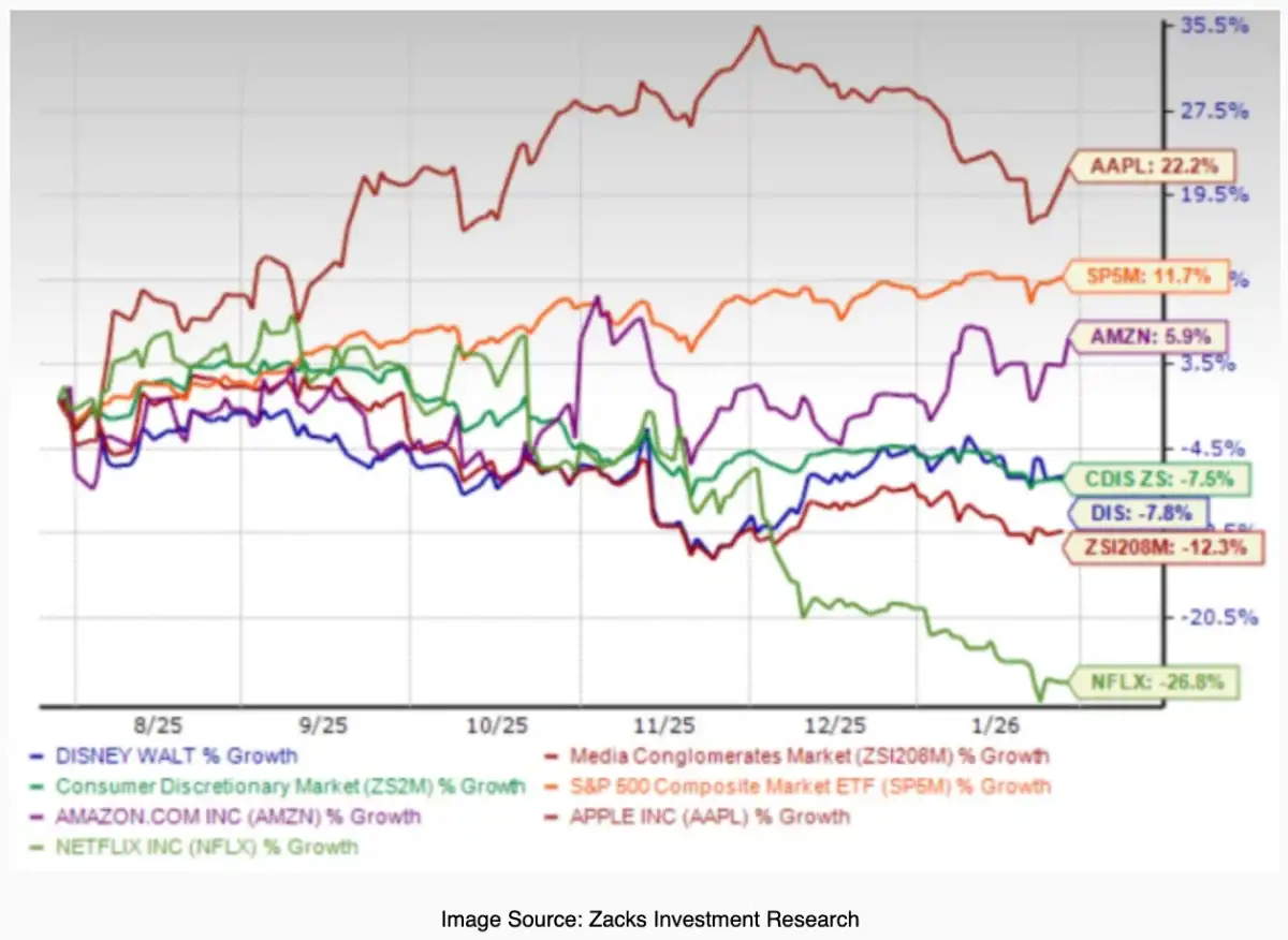 Competition in the streaming space is also heating up against heavyweights like Netflix and Amazon Prime Video. Disney stock is down 7.8 percent over the last six months, lagging behind the broader sector performance.