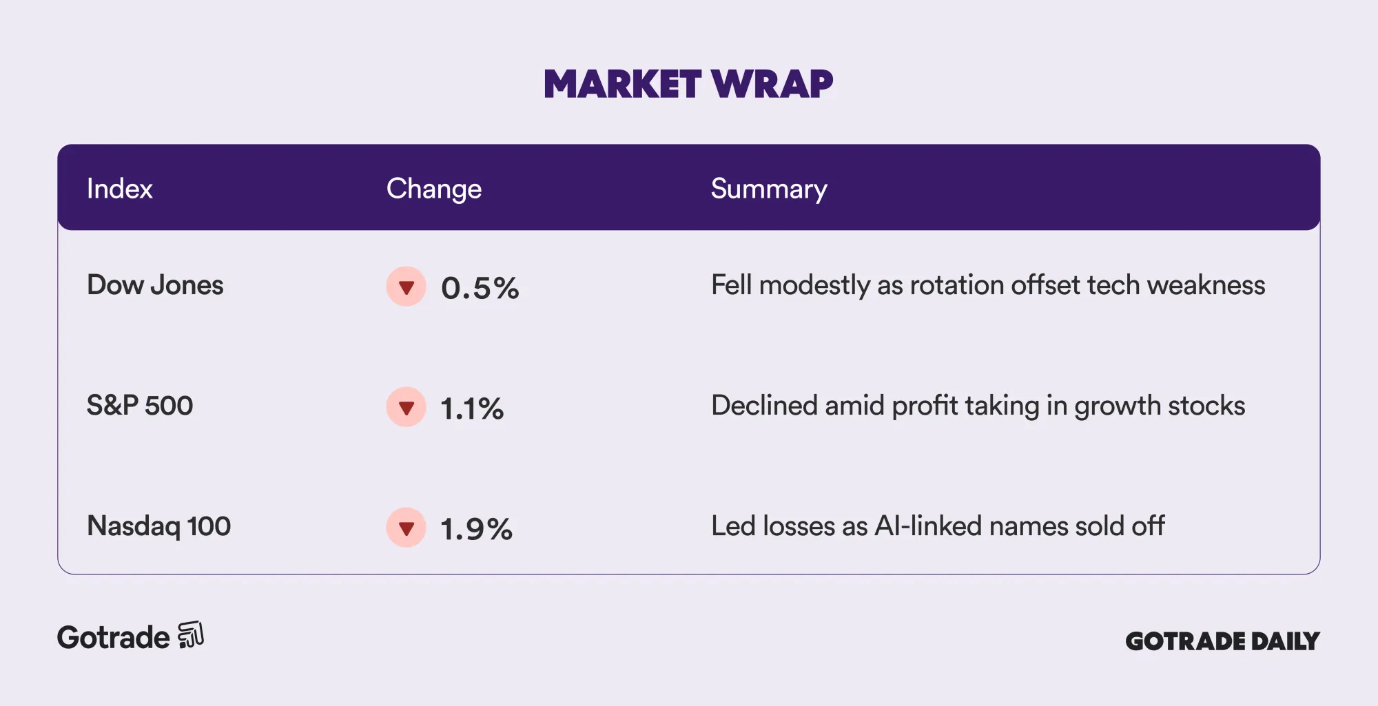 US stocks fell on Friday, extending a pullback that reflected growing investor caution around large technology names tied to artificial intelligence. Losses were led by the Nasdaq, while broader benchmarks showed more moderate declines as capital continued rotating into other areas of the market.