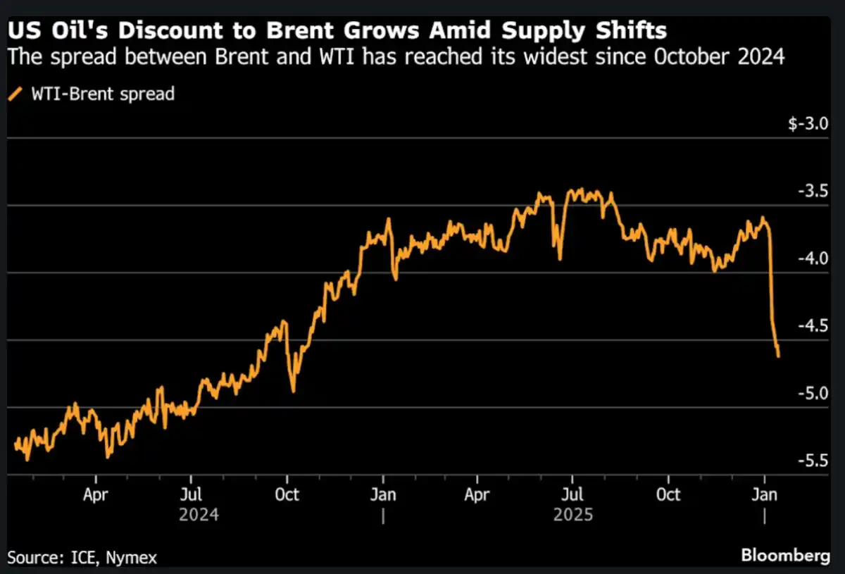 The combo of rising inventories, more Venezuelan oil flowing to the US, and disruptions at a Black Sea terminal has pushed WTI prices down significantly compared to Brent.
