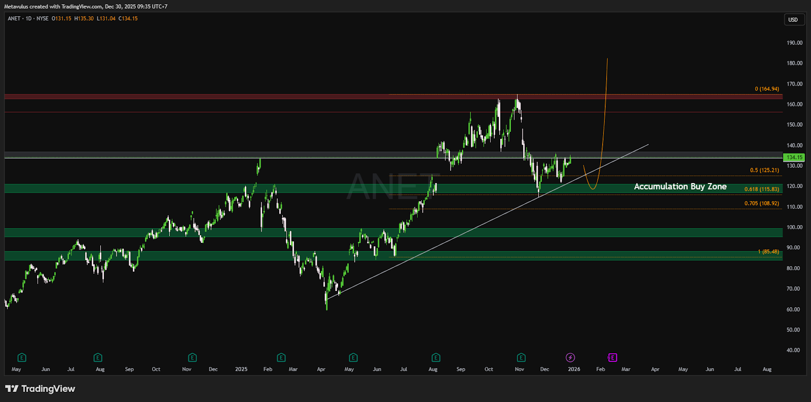 ANET terlihat seperti quality growth yang sedang “mendingin” setelah puncak, dan lebih menarik dimainkan sebagai akumulasi bertahap di area demand, bukan diburu saat harga lagi mepet resistance.