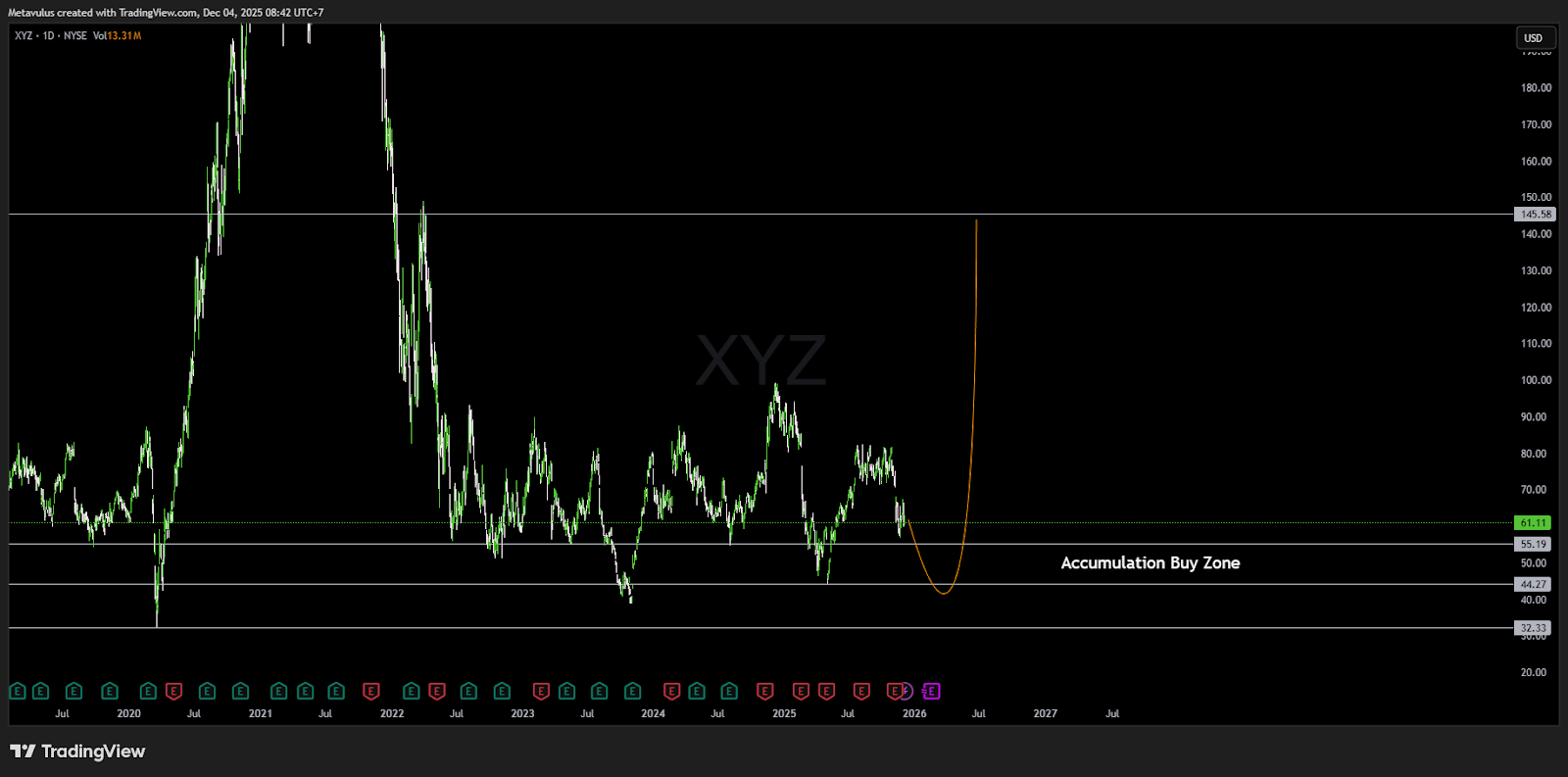 - Potensi pembentukan “rounded bottom” menuju 2026 jika Cash App & Squaregrowth konsisten.