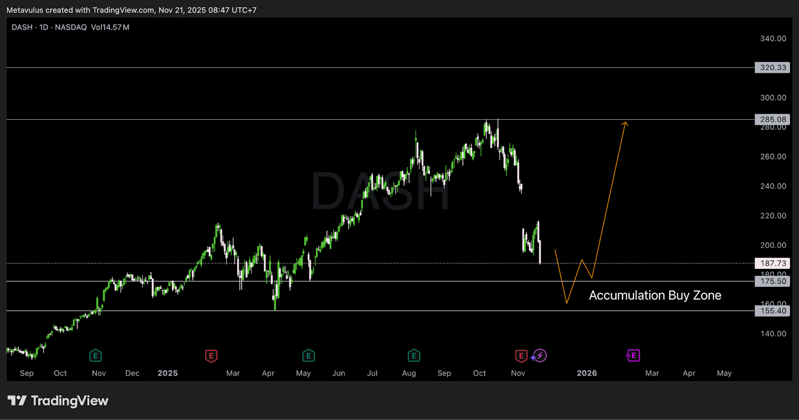 DoorDash (NASDAQ: DASH) just entered a sharp correction, down ~30% from the peak, even though fundamentals remain extremely strong.