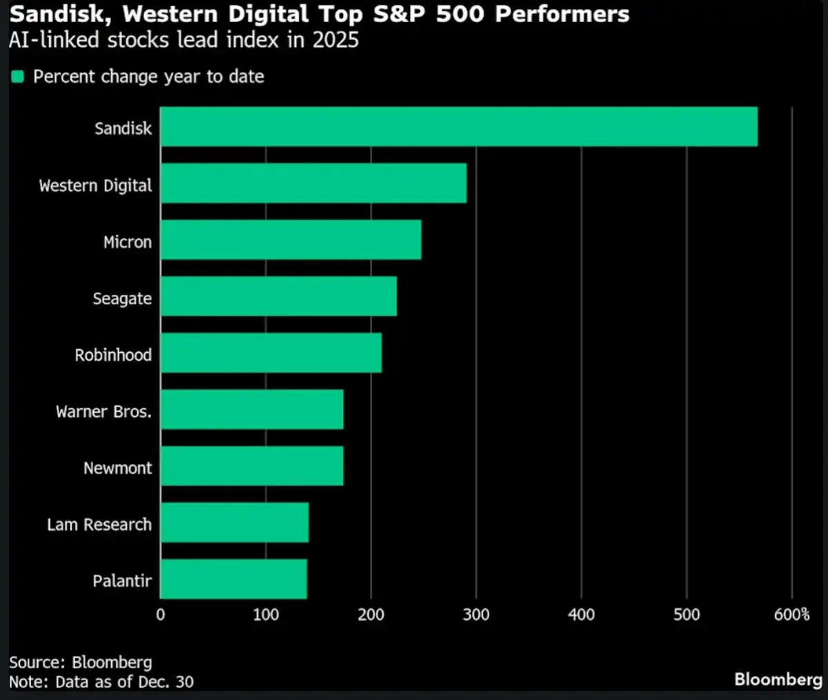 This massive capital flow is benefiting data storage companies like Sandisk, Western Digital Corporation, and Seagate Technology Holdings plc, which were three of the top four performers in the S&P 500. Additionally, new index additions like Robinhood Markets, Inc. and Carvana Co. also posted triple-digit gains.