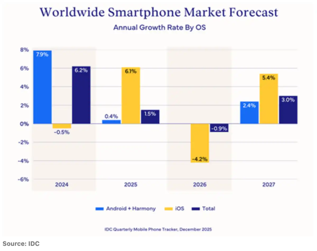 IDC projections suggest iOS smartphone unit sales might dip or stagnate next year. Delays in new iPhone models and memory supply constraints are the fundamental factors weighing on these volume predictions.