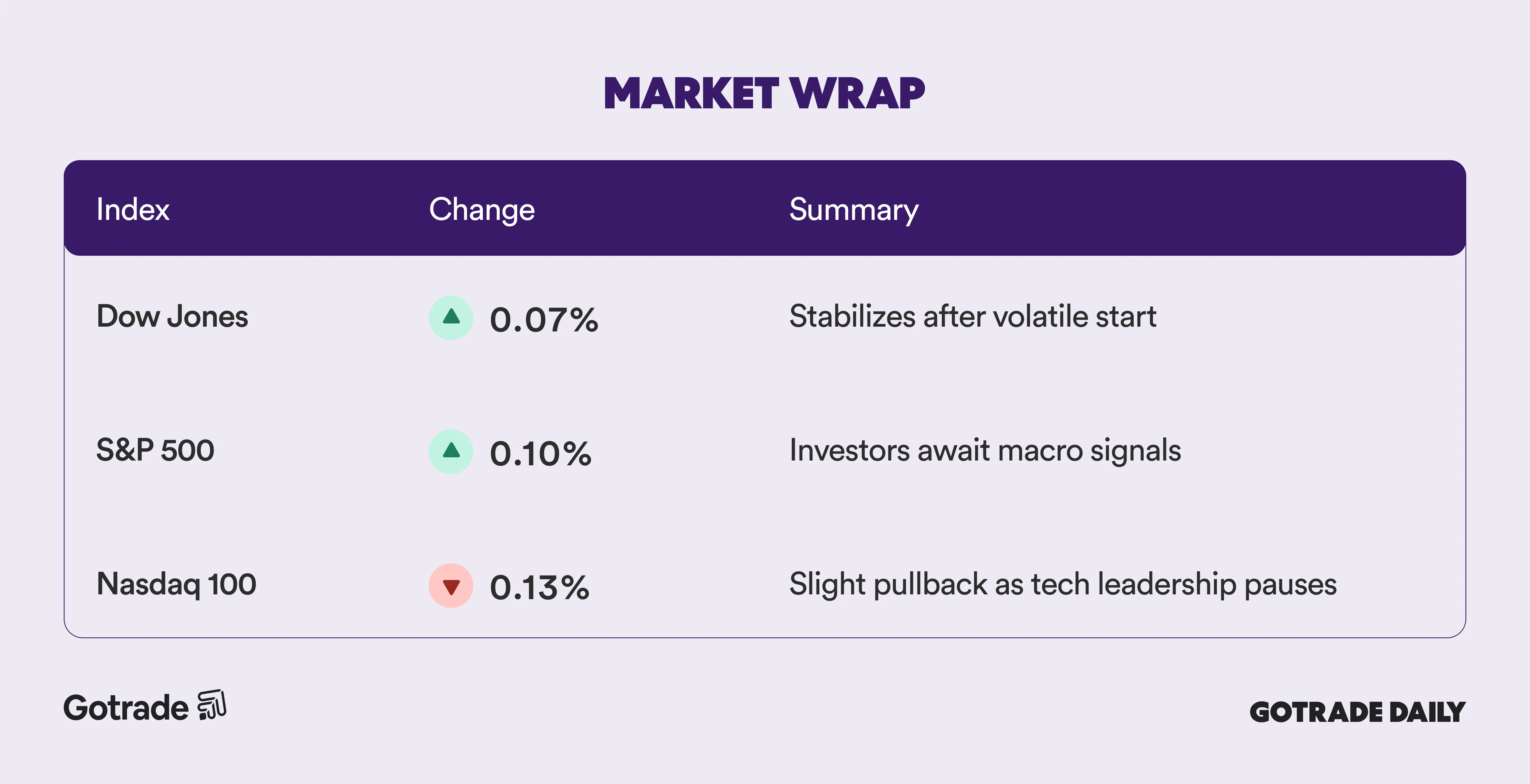 U.S. equities edged higher in a volatile session Tuesday as investors positioned ahead of a dense macro calendar later this week. The Nasdaq Composite rose 0.1%, recovering from an early drop of more than 1%, while the S&P 500 and Dow Jones Industrial Average also gained about 0.1%.