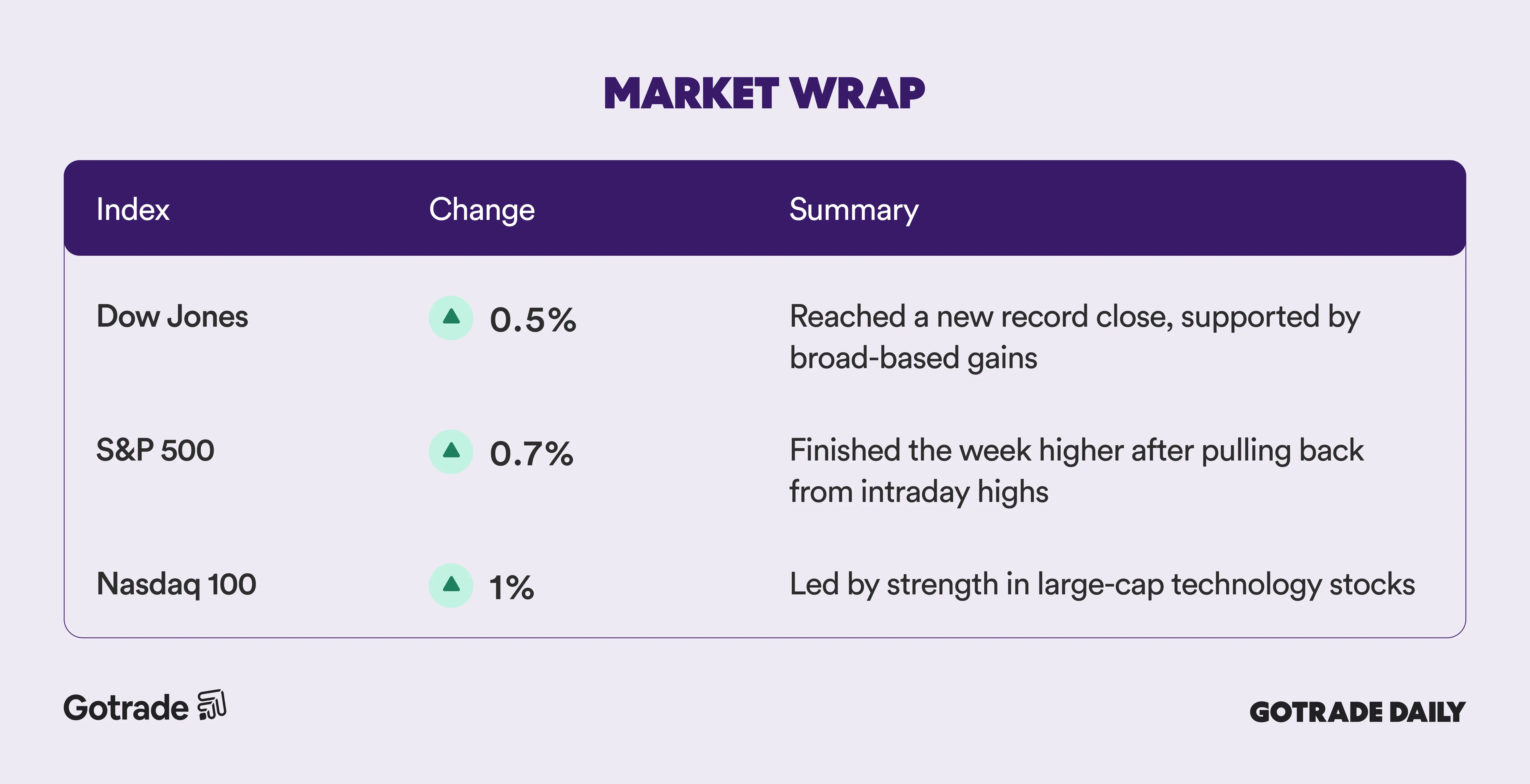 US stocks closed out the first full week of trading in 2026 on a positive note, with technology stocks leading gains and helping major indexes finish higher. The Dow Jones Industrial Average (DJI) and the S&P 500 (SP500) both ended Friday at fresh record highs, while the Nasdaq 100 (NDX) capped the week with solid momentum.