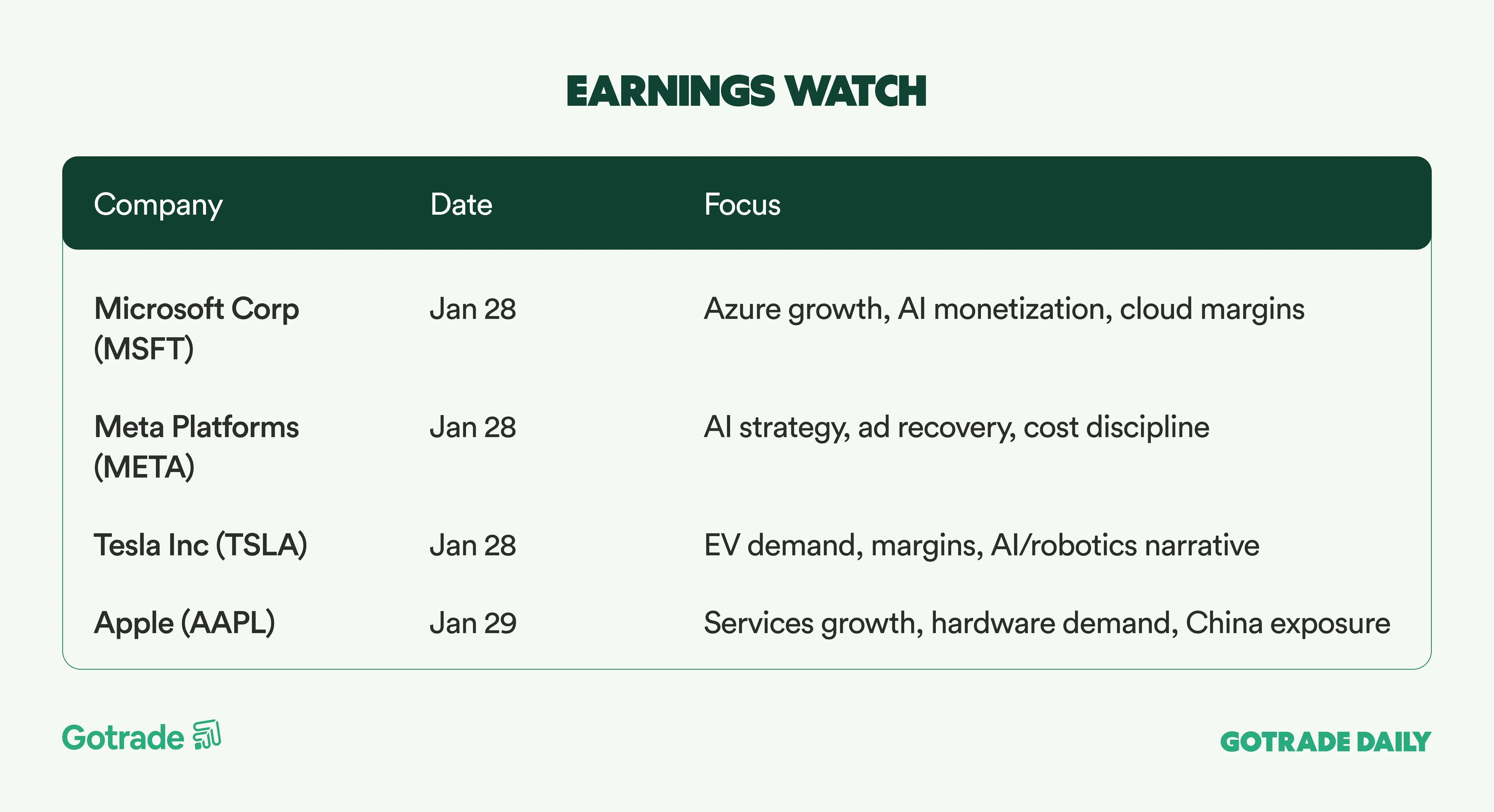 Market leadership remained concentrated in Big Tech. Apple (AAPL) gained more than 1%, Microsoft (MSFT) rose over 2%, and investor focus shifted toward earnings from Meta (META), Microsoft (MSFT), and Tesla (TSLA) on Wednesday, followed by Apple (AAPL) on Thursday. More than 90 S&P 500 companies are scheduled to report by the end of the week, making this a key inflection period for markets.