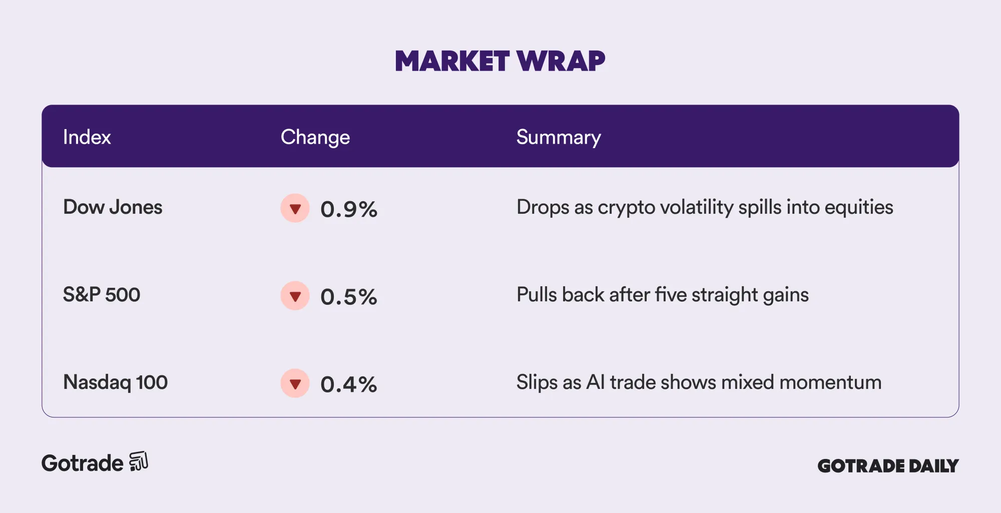 Markets opened December on weaker footing as volatility extended into the new month. US equities slipped on Monday, snapping a five day winning streak, with the S&P 500 down 0.53 percent, the Nasdaq off 0.38 percent, and the Dow Jones falling 0.9 percent. The pullback followed a sharp selloff in Bitcoin, which slid about 6 percent and pressured risk assets across the board. It was Bitcoin’s worst day since March and added to broader caution inside the AI trade as profit taking hit names like Broadcom and Super Micro Computer.