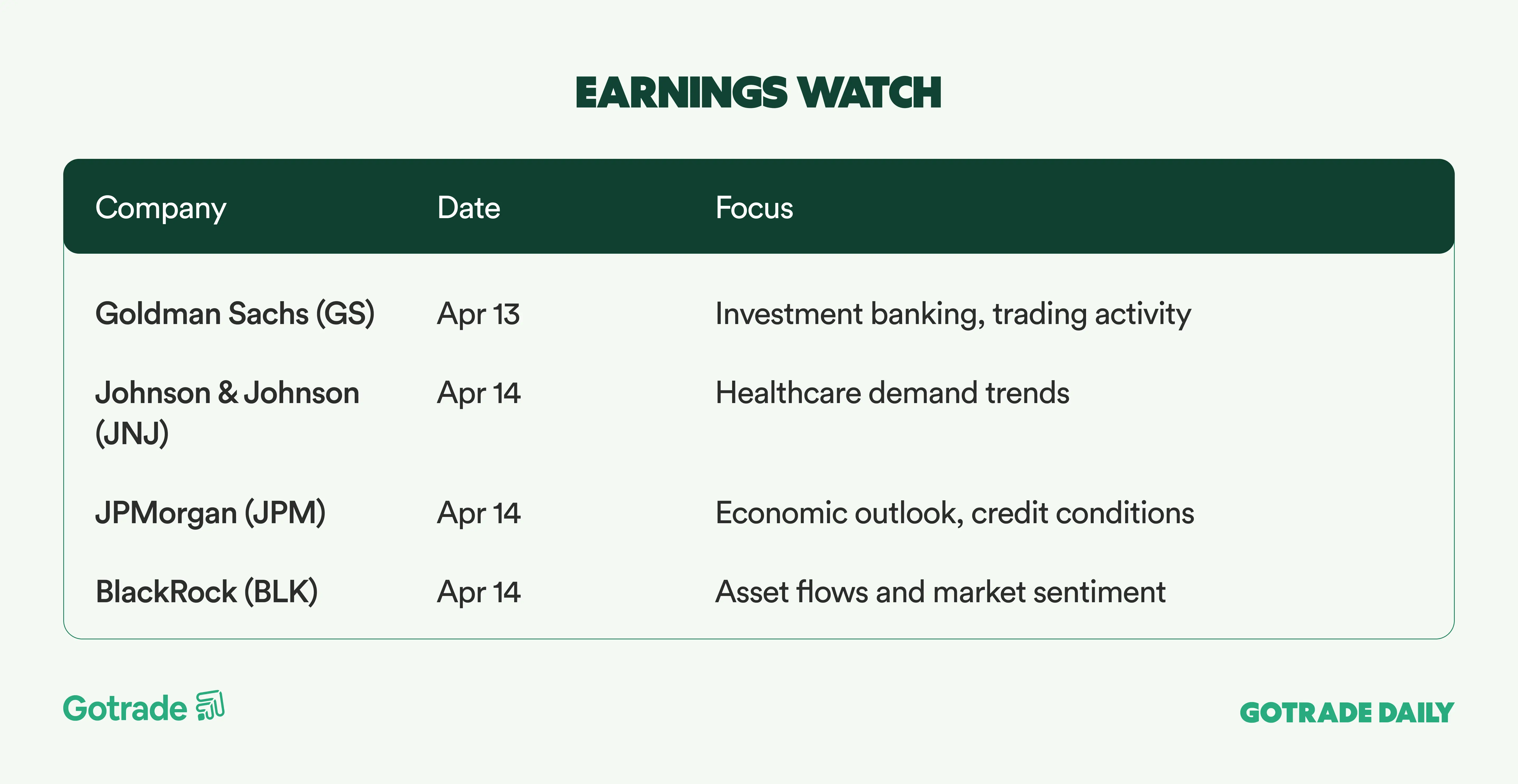 Attention is now shifting toward a new set of catalysts, with earnings season set to ramp up. Major banks including Goldman Sachs (GS), JPMorgan (JPM), and Bank of America (BAC) are scheduled to report, offering a read on trading conditions, deal activity, credit trends, and the broader health of the U.S. economy.