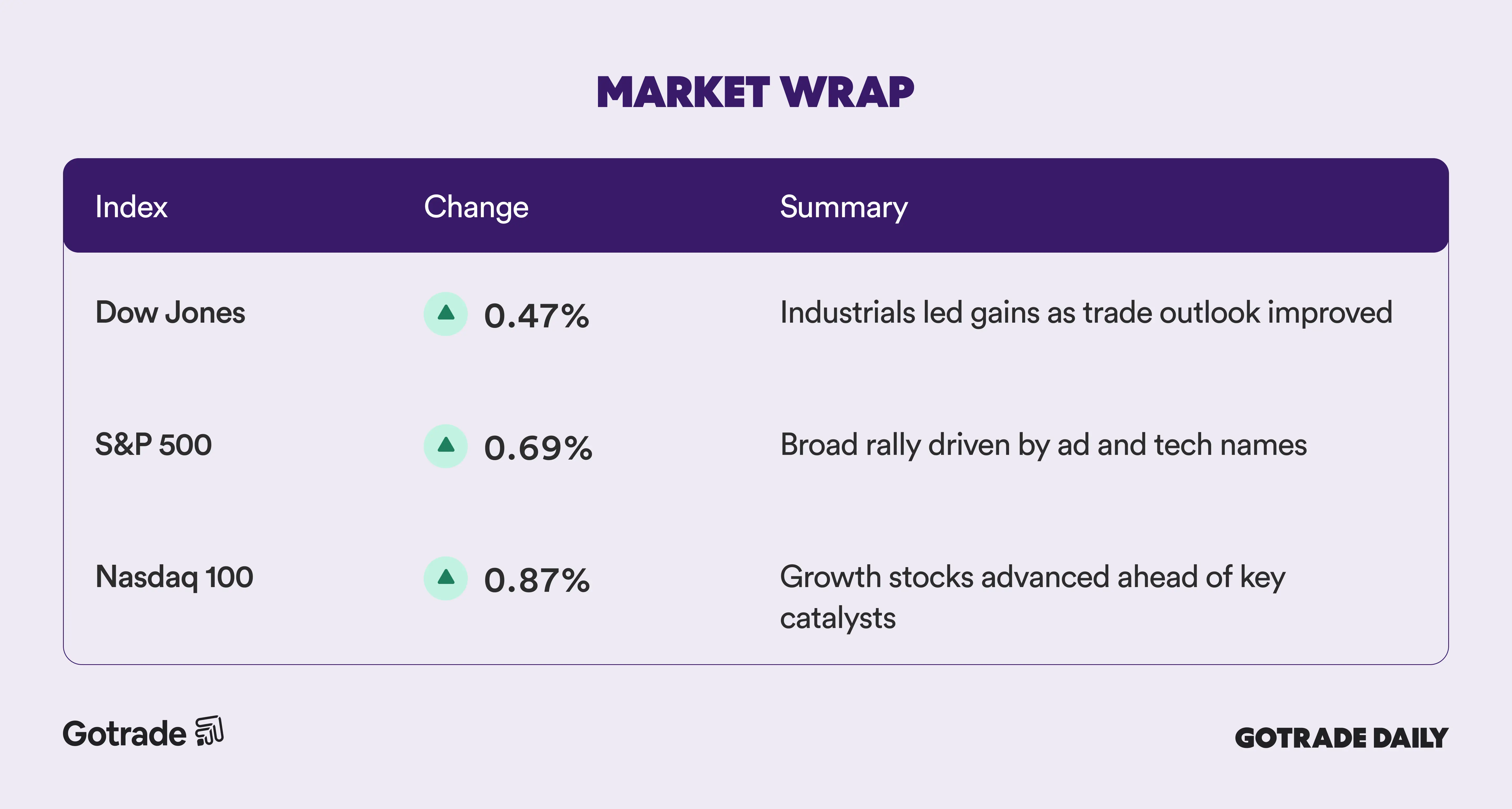 U.S. stocks moved higher after the Supreme Court struck down most of President Donald Trump’s tariff policies, sparking a rally in digital-advertising companies. Alphabet (GOOGL), Meta (META), Snap (SNAP), and Pinterest (PINS) were among the biggest gainers as easing tariff pressure could support higher marketing spending from global clients.