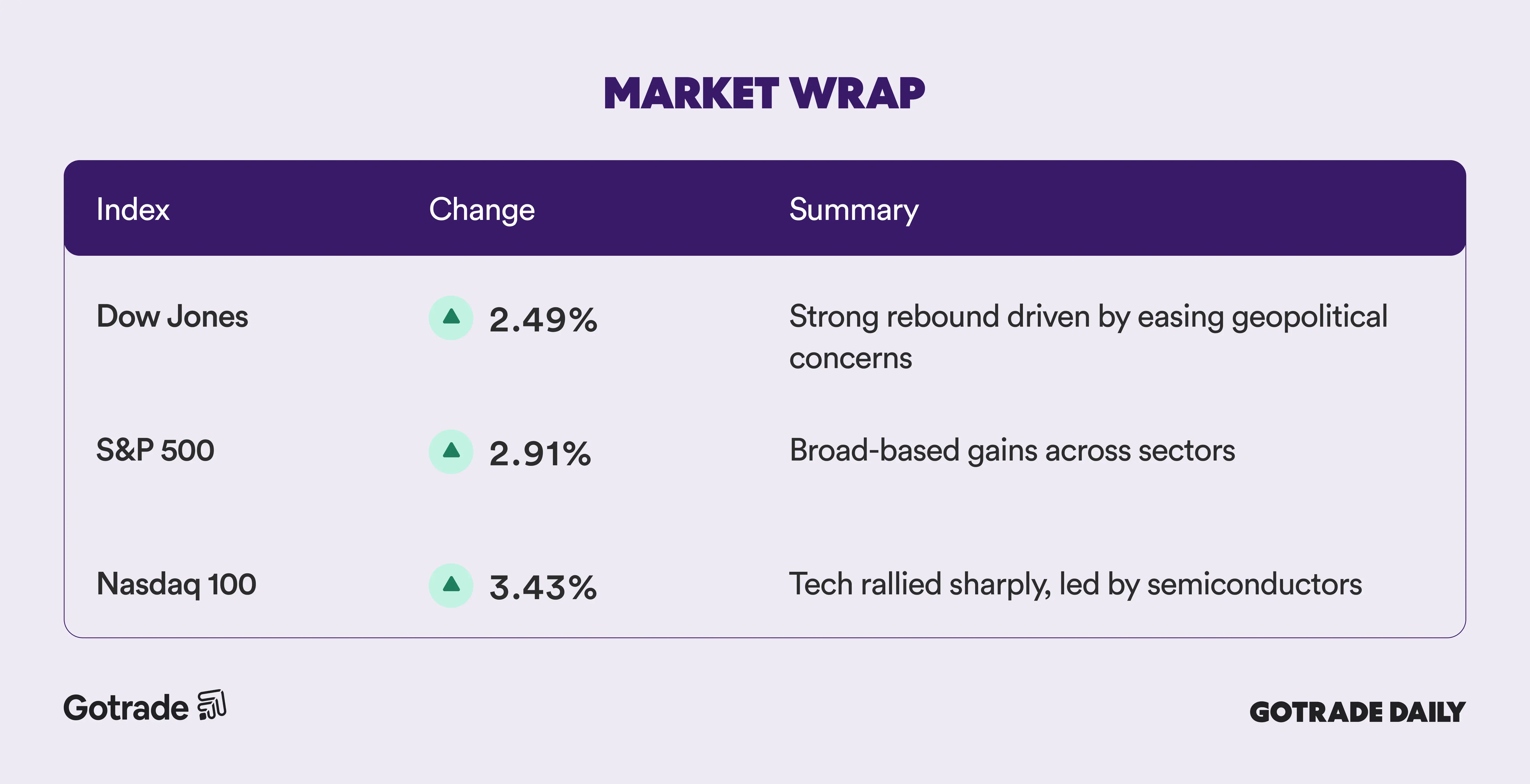 U.S. stocks surged on Tuesday as renewed optimism around a potential end to the Iran war lifted sentiment across markets. The Dow Jones Industrial Average jumped more than 1,100 points, while the S&P 500 rose 2.9% and the Nasdaq Composite gained 3.8%.