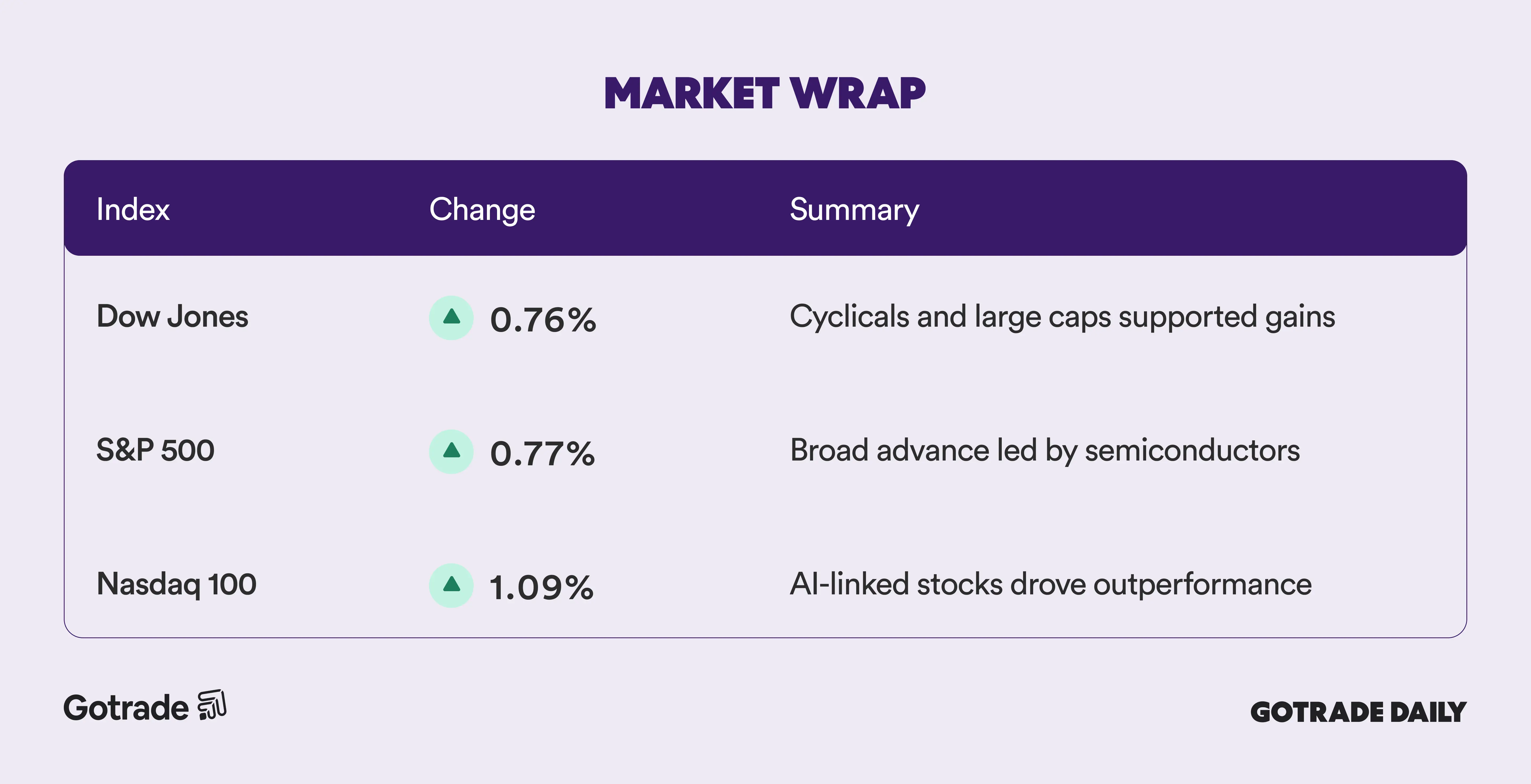 U.S. equities moved higher Tuesday as technology and semiconductor stocks led gains, signaling improving sentiment after recent volatility tied to artificial-intelligence disruption fears. The S&P 500 rose 0.77%, the Nasdaq Composite gained 1.04%, and the Dow Jones advanced 0.76%, with strength concentrated in chipmakers and enterprise software.