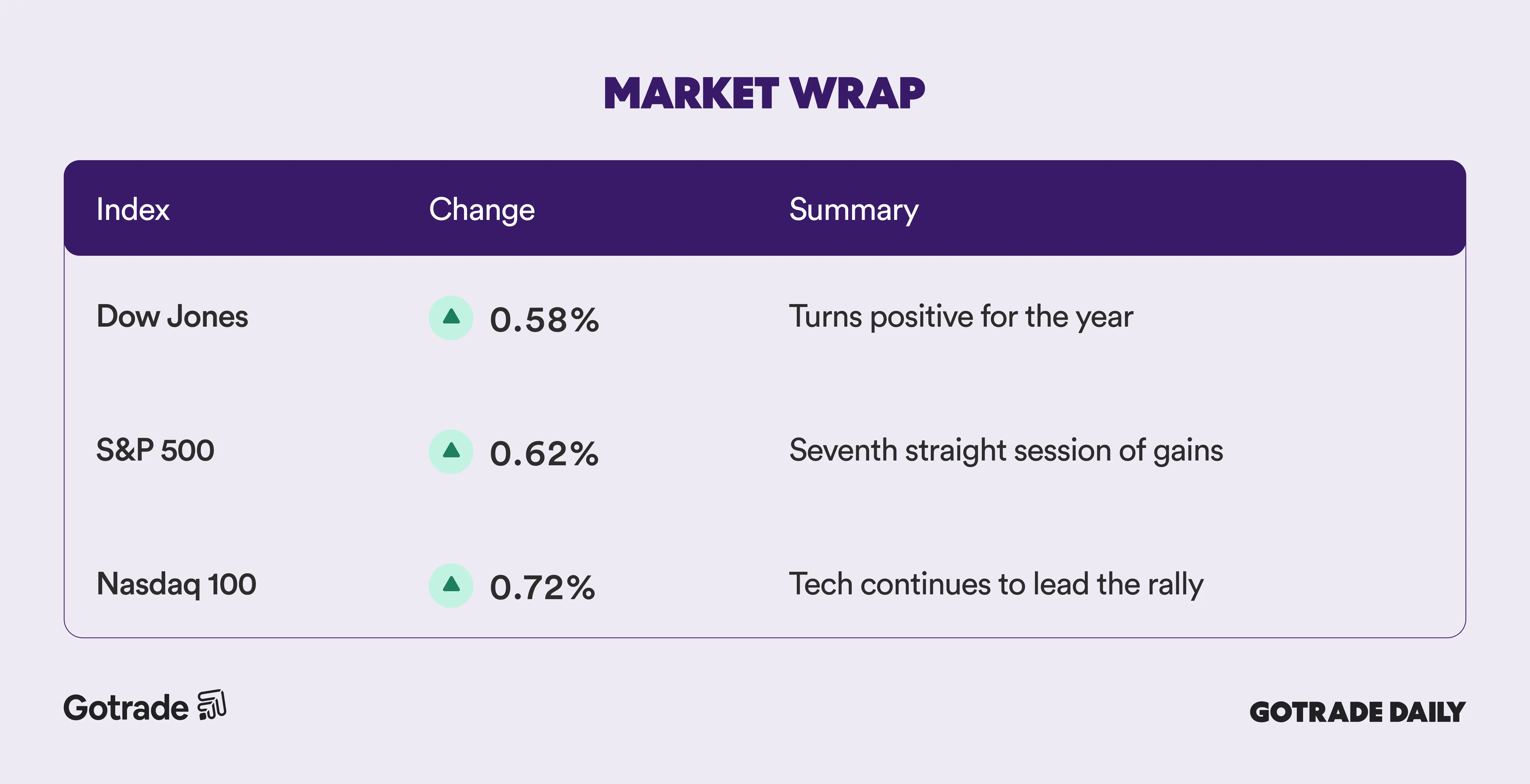 U.S. stocks ended higher on Thursday as investors continued to monitor developments around the U.S.–Iran ceasefire, helping extend the market’s recent rally. The S&P 500 rose 0.6%, the Nasdaq Composite gained 0.8%, and the Dow Jones Industrial Average climbed 0.6%, with the Dow turning positive for the year and both the S&P 500 and Nasdaq marking a seventh straight session of gains.
