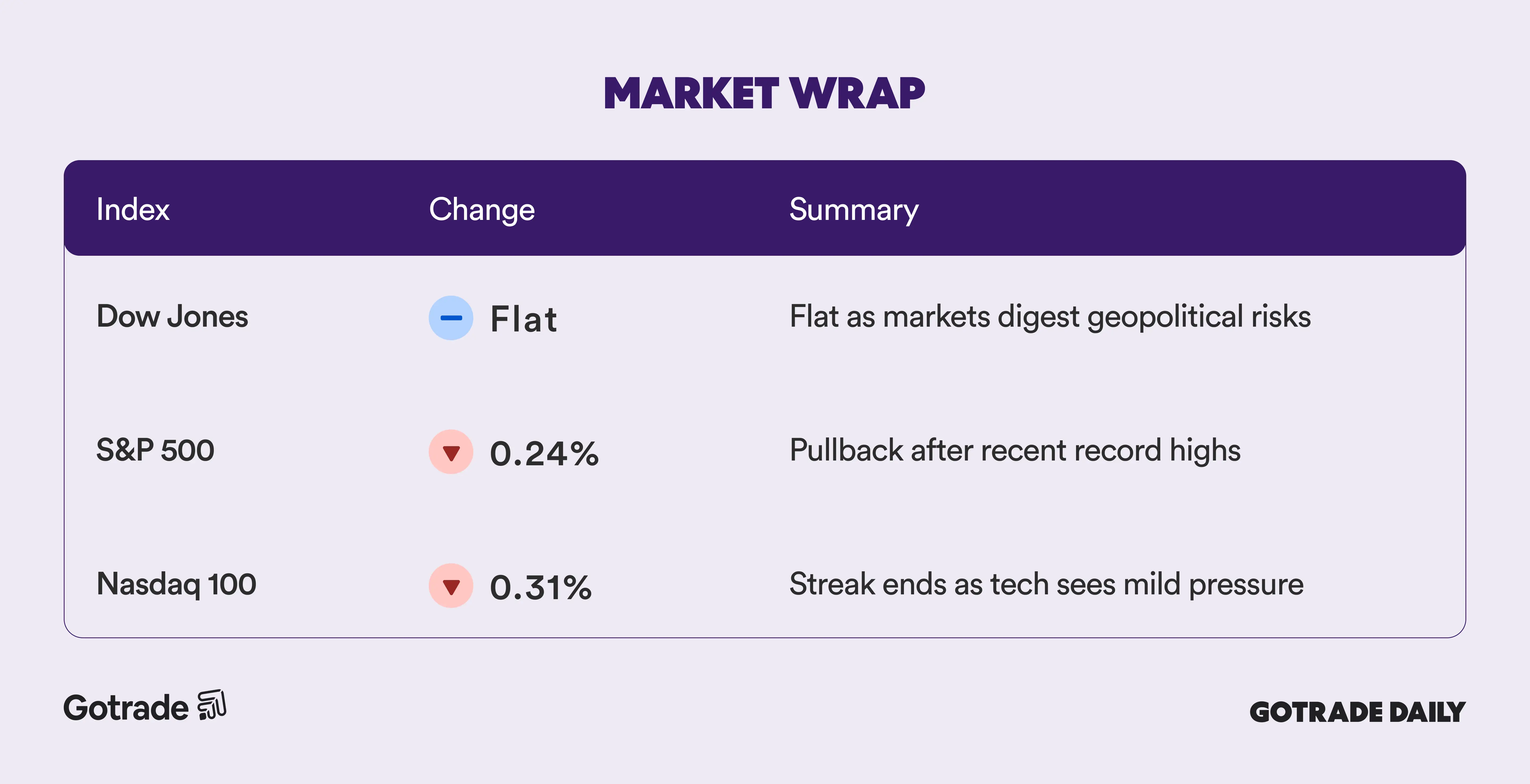 U.S. stocks edged lower on Monday as renewed tensions between the U.S. and Iran pressured sentiment, snapping the Nasdaq Composite’s 13-day winning streak, its longest since 1992. The S&P 500 slipped 0.24%, while the Dow Jones was little changed.