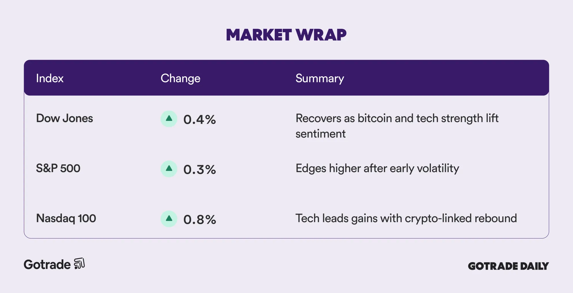 US stocks bounced back on Tuesday as a sharp rebound in bitcoin and renewed strength across mega-cap tech helped offset the turbulence seen at the start of the week. The Dow rose 0.4 percent, the S&P 500 added 0.3 percent, and the Nasdaq 100 gained 0.8 percent, with risk appetite improving after Monday’s selloff.