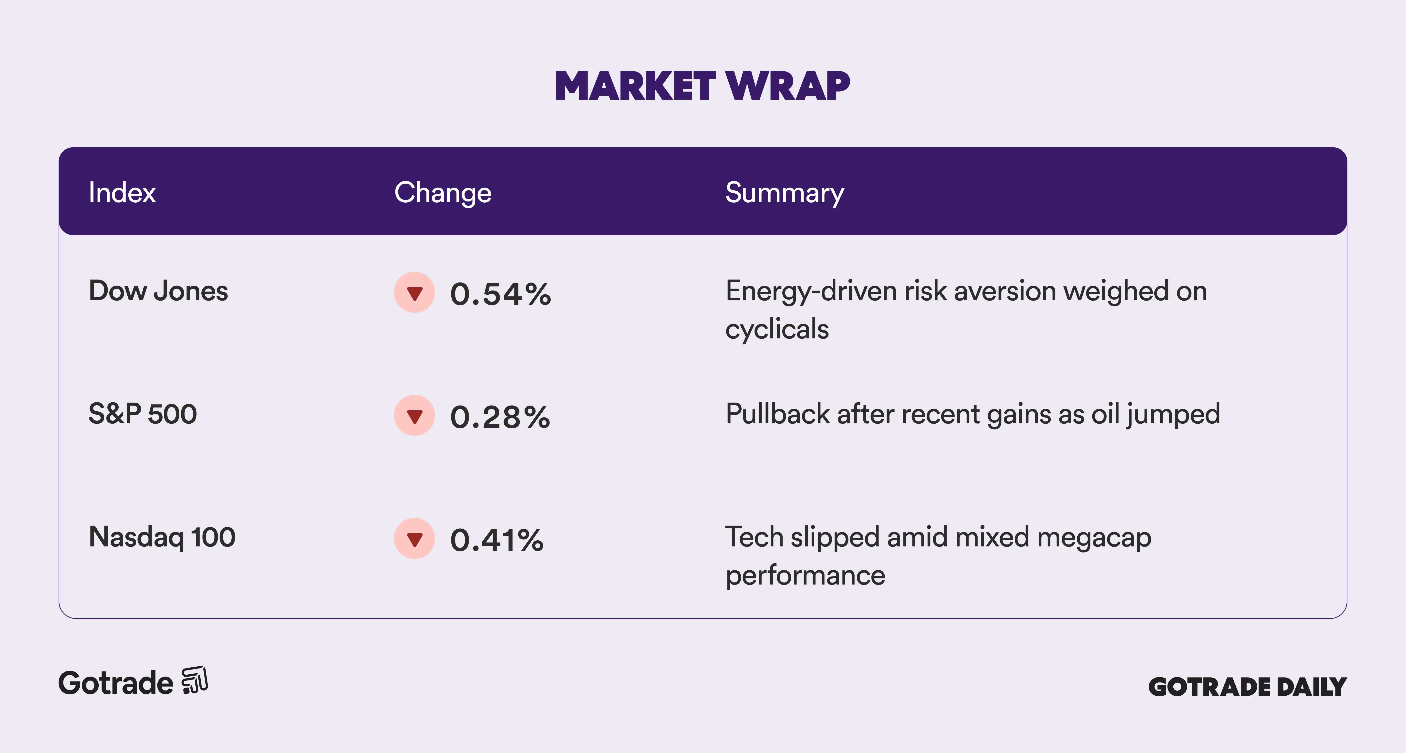 U.S. equities declined Thursday, snapping a three-session winning streak for major indexes as geopolitical tension between Washington and Tehran pushed crude prices to a six-month high. The Dow Jones Industrial Average fell 0.5%, while the S&P 500 and Nasdaq Composite each slipped about 0.3%, reflecting renewed caution after the previous session’s tech-led stabilization.