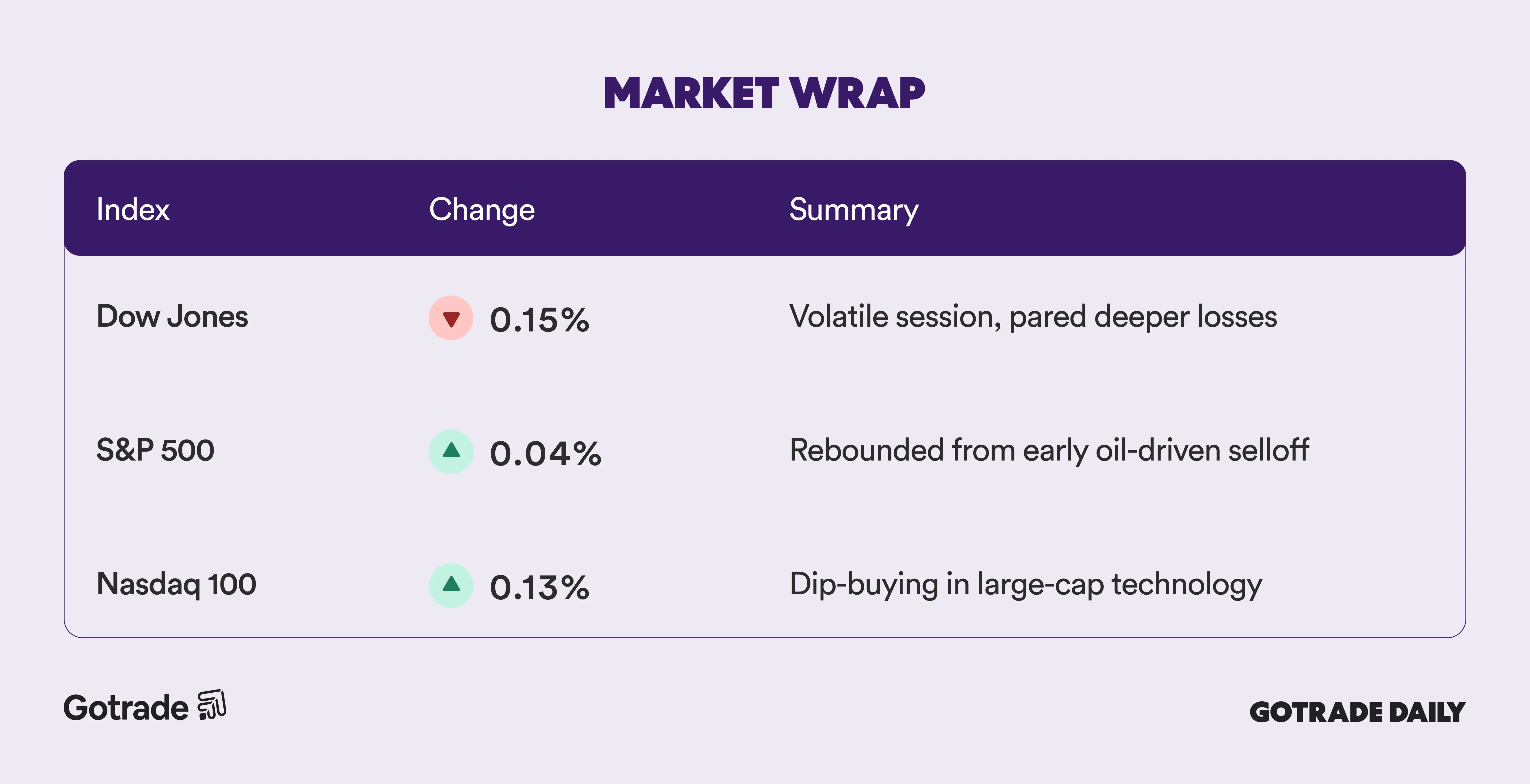 Equities recovered alongside the moderation in oil prices. The S&P 500 rebounded from a 1.2% intraday drop to close marginally positive, while the Nasdaq 100 ended modestly higher. The Dow Jones Industrial Average finished slightly lower after swinging nearly 600 points at its lows.