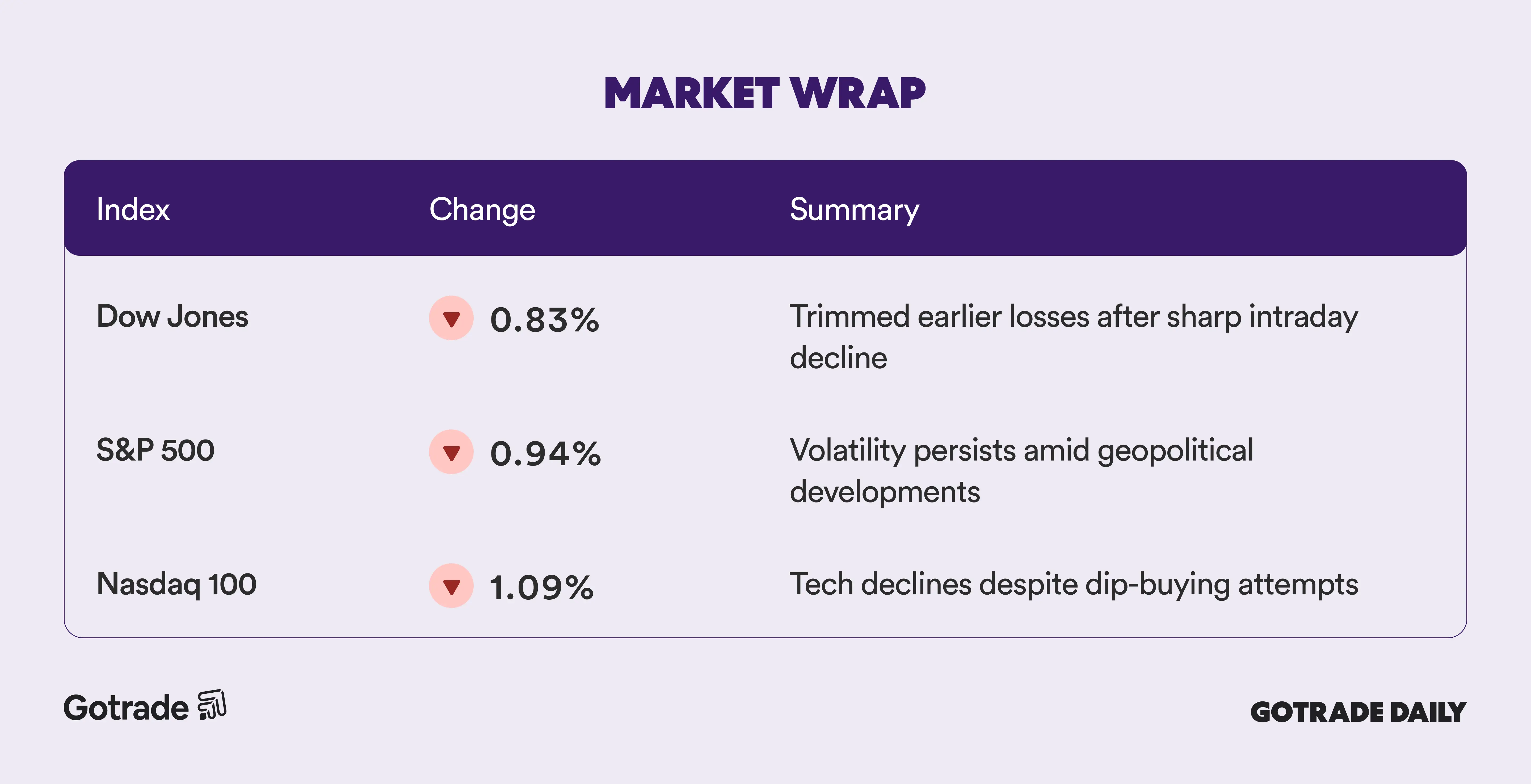 U.S. stocks closed lower Tuesday as markets remained volatile amid escalating tensions in the Middle East, though major indexes recovered well from steep intraday losses. The Dow Jones Industrial Average, S&P 500, and Nasdaq 100 finished down about 0.8%, 0.9%, and 1.1%, respectively, after trimming much deeper declines earlier in the session.