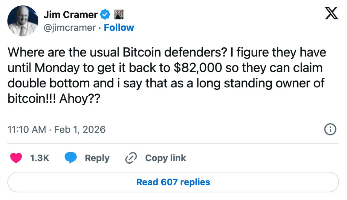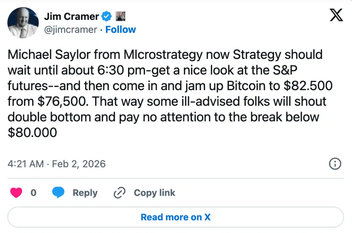 Benzinga, Jim Cramer Says Michael Saylor Should 'Jam-Up' Bitcoin To $82,000: 'That Way Some Ill-Advised Folks Will Shout Double Bottom’. Accessed on February 3, 2026