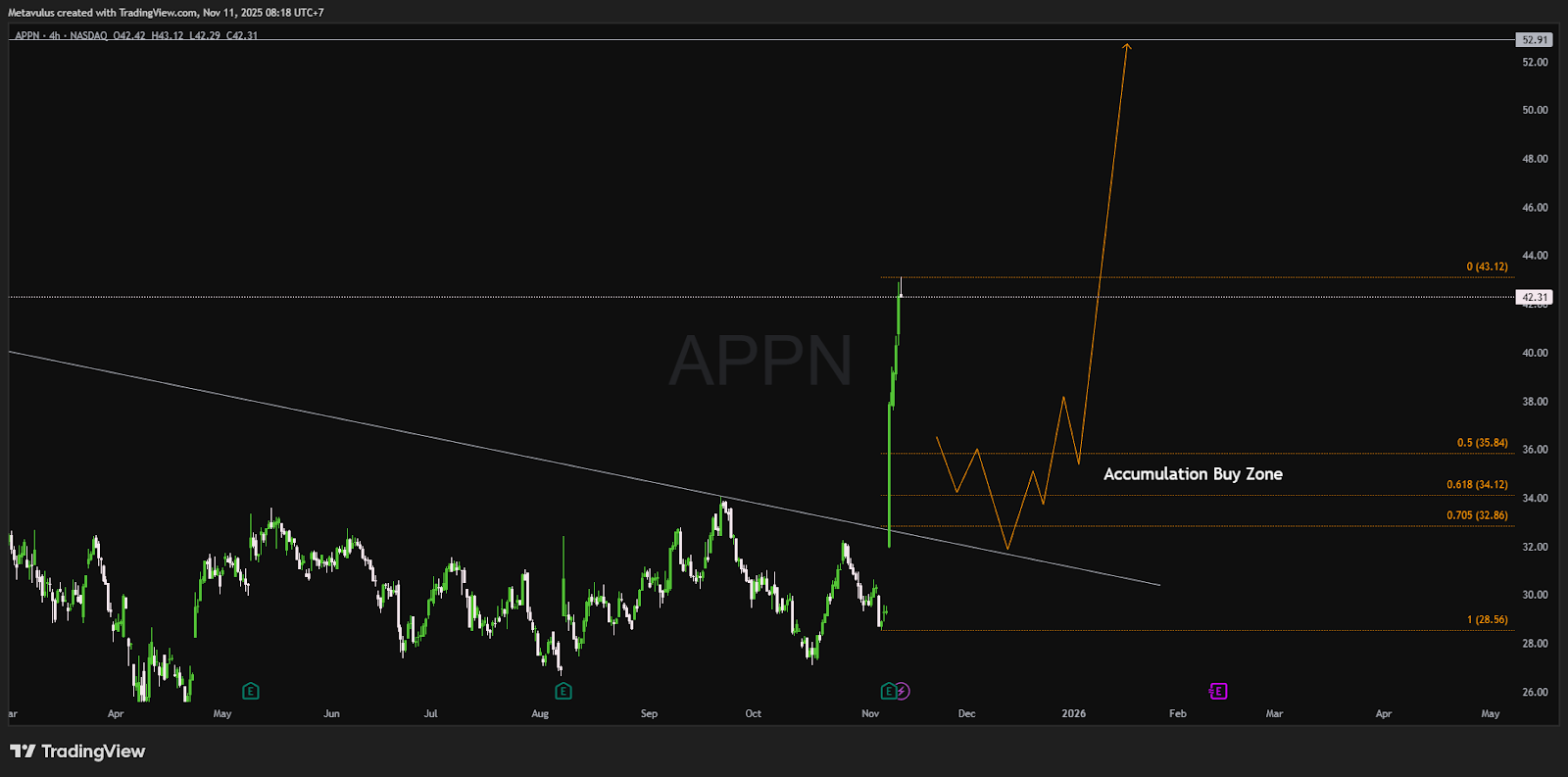 Appian’s explosive post-earnings breakout has created a new trend structure. After a strong leg up, a short-term correction into the $36–33 buy zone is likely before continuation toward $53+, assuming broader tech momentum holds.
