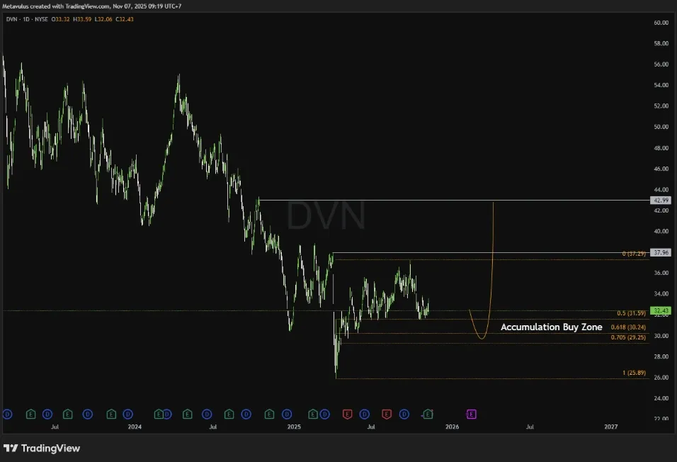 Technically, DVN remains range-bound, consolidating between $30–38.