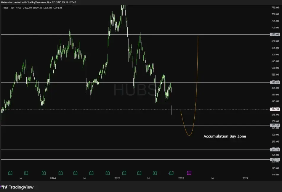 Technically, HUBS has pulled back to a multi-month range. The base structure remains intact — a likely scenario involves a retest of the $335–$330 buy zone before a rebound toward $495, then $675 if market sentiment normalizes.