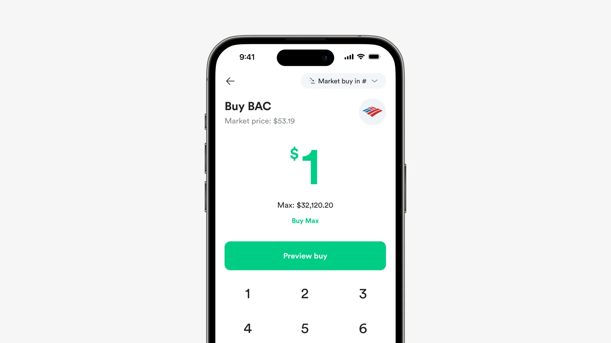 1. Buka Gotrade, cari Bank of America (BAC) di kolom pencarian, masuk ke halaman grafik dan pilih buy.