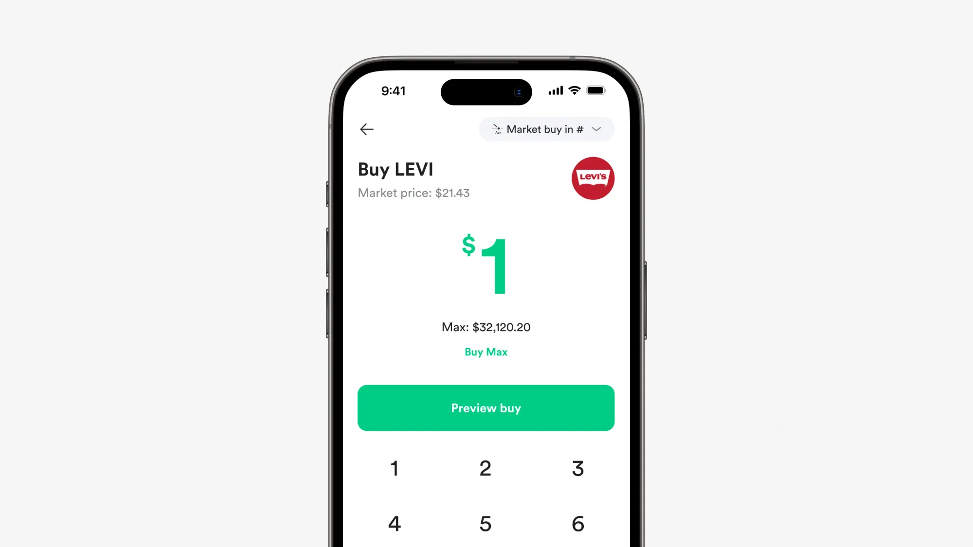 1. Buka Gotrade, cari Levi's (LEVI) di kolom pencarian, masuk ke halaman grafik dan pilih buy.