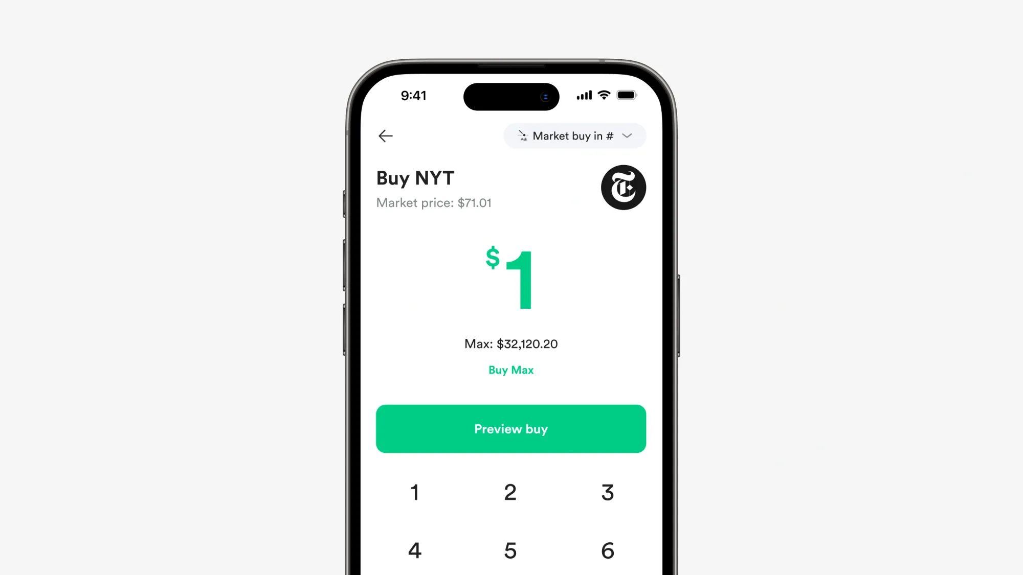 1. Buka Gotrade, cari New York Times (NYT) di kolom pencarian, masuk ke halaman grafik dan pilih buy.