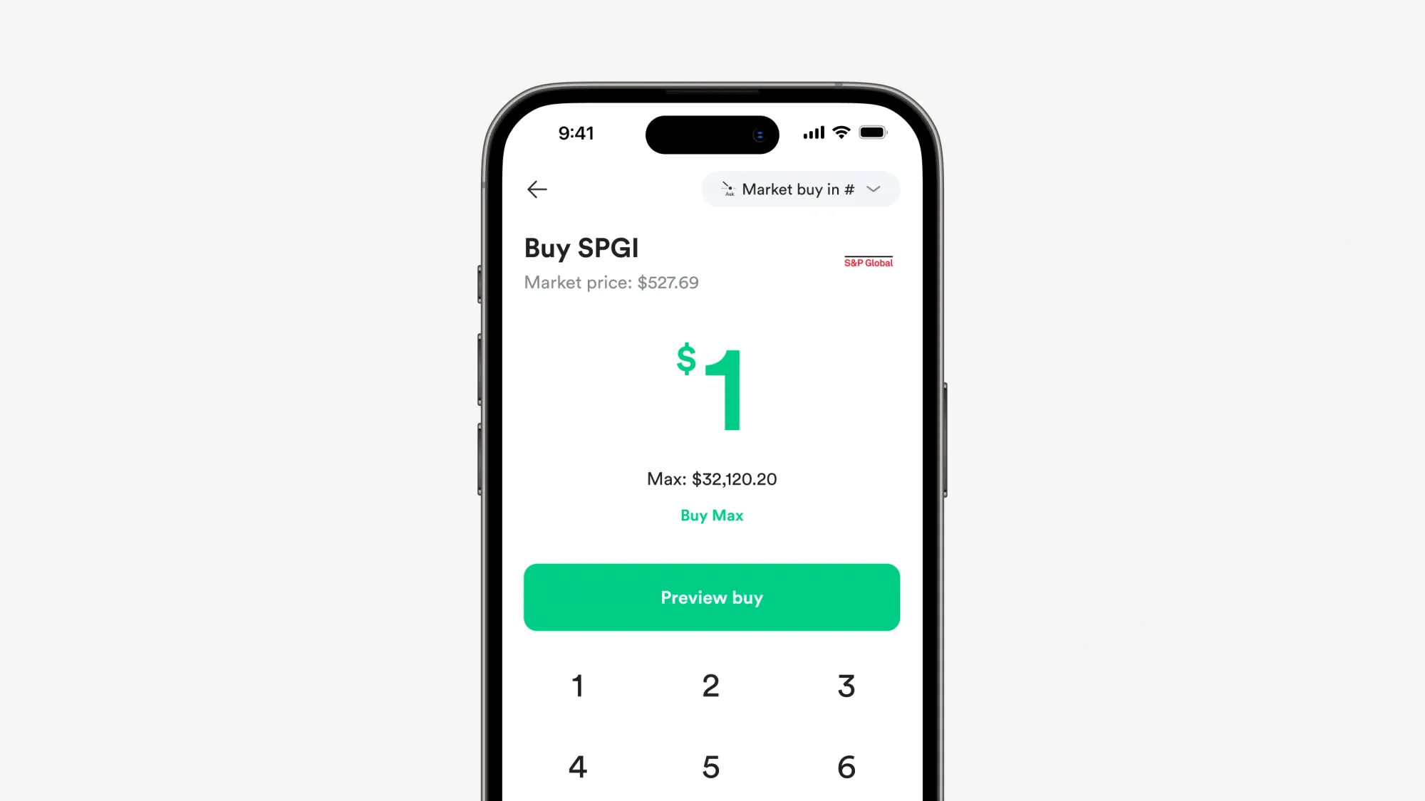 1. Buka Gotrade, cari S&P Global (SPGI) di kolom pencarian, masuk ke halaman grafik dan pilih buy.