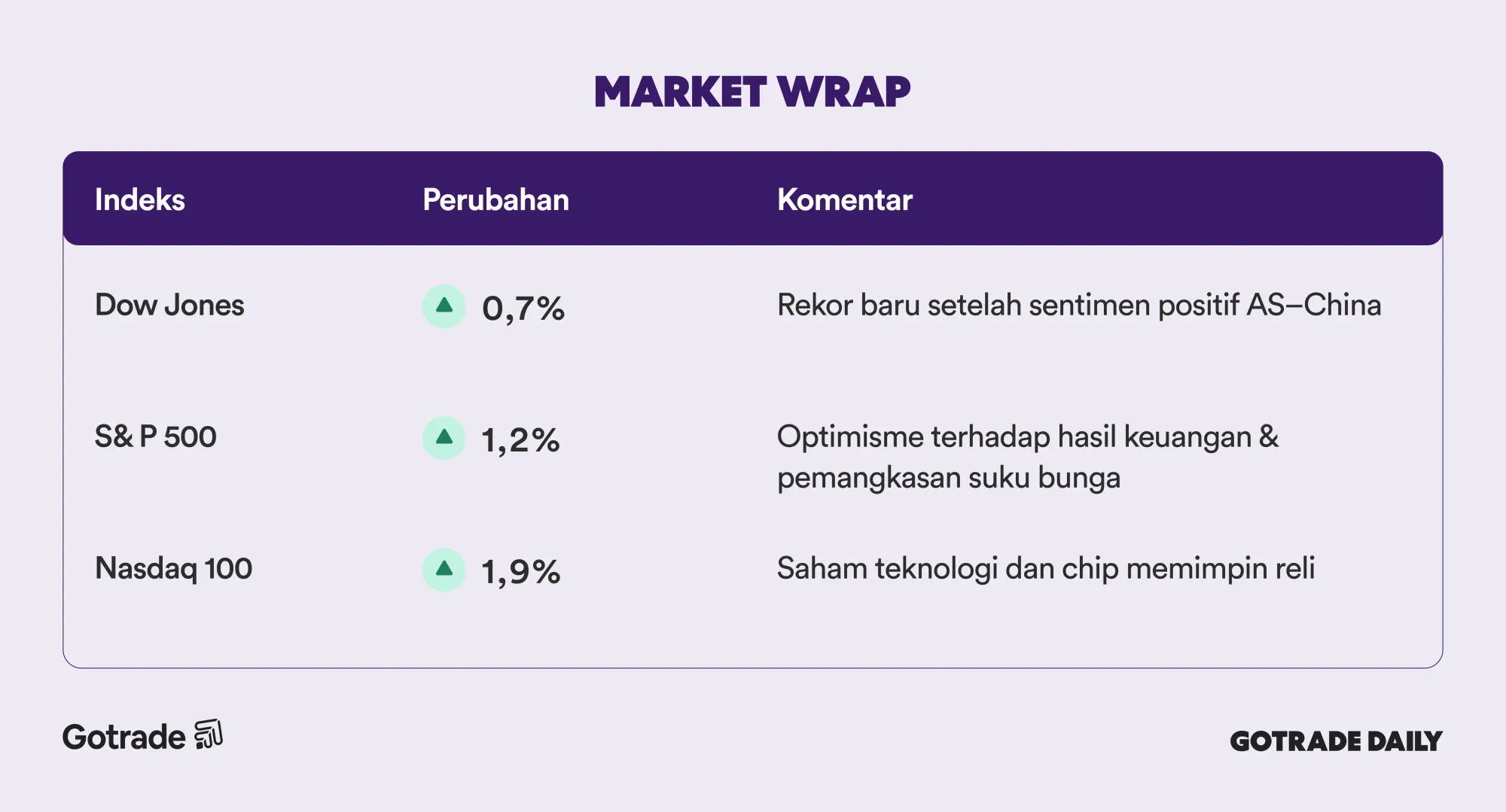 Optimisme hubungan dagang AS–China dan ekspektasi hasil keuangan yang solid membuat pasar bergerak dengan percaya diri.
