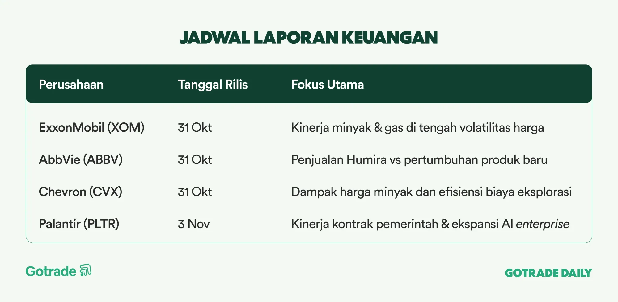 Amazon (AMZN) naik 13.2% setelah mencatat pendapatan kuartal III sebesar US$180.2 miliar (+12% YoY) dan operating income US$17.4 miliar (tanpa beban khusus bisa mencapai US$21.7 miliar).