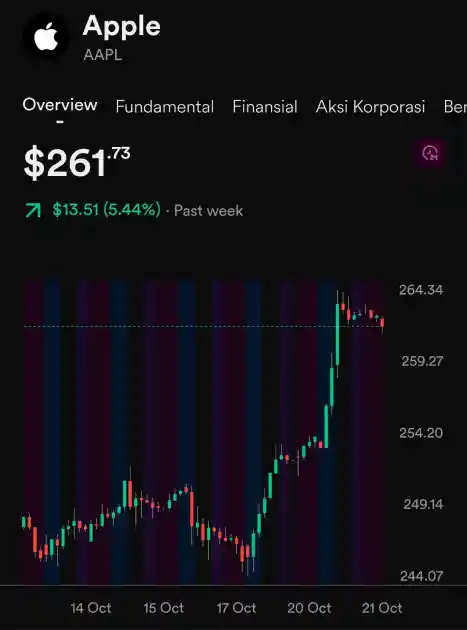 Harga saham Apple (AAPL) baru saja mencetak rekor tertinggi sepanjang masa (ATH) pada hari Senin, dengan penutupan di level $262.24.