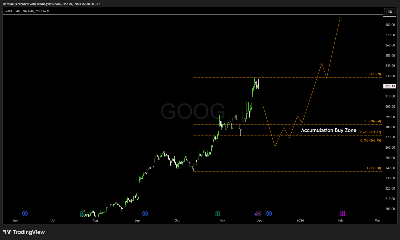 - Rally dari ~US$260 → >US$320 terjadi seiring katalis fundamental (Gemini 3, upgrade analis, berita Buffett masuk).
