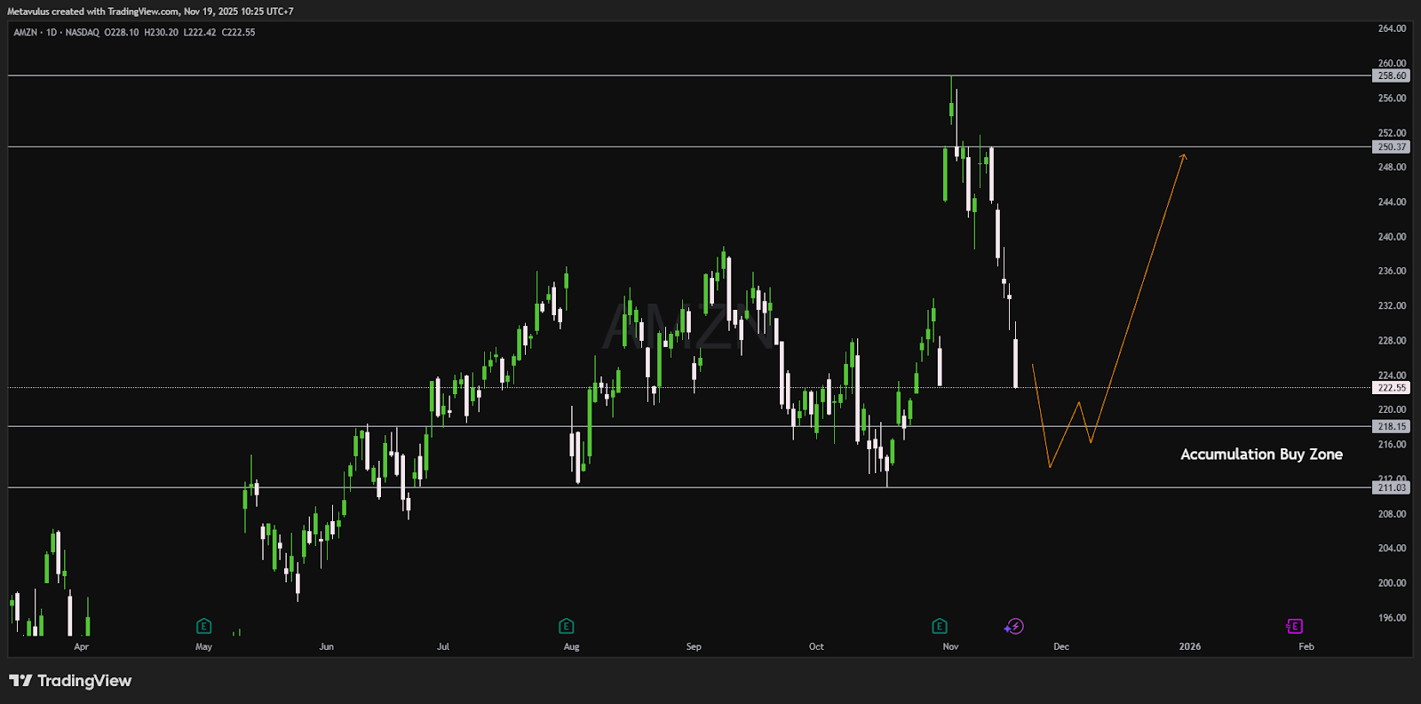 Selama harga bertahan di atas 211, struktur bullish jangka menengah tetap utuh dan target naik kembali ke 250–260 sangat wajar setelah sentimen stabil.
