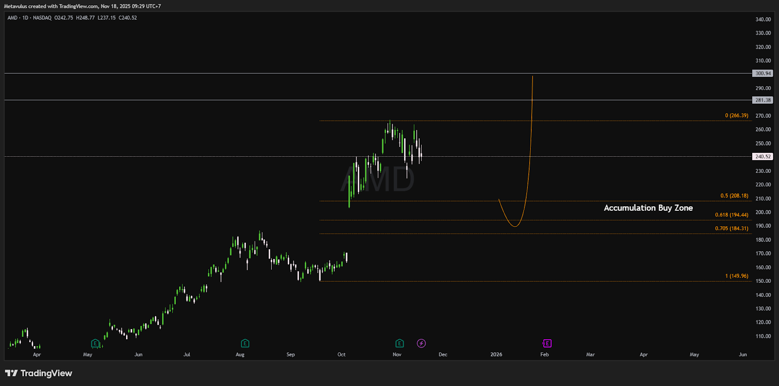 AMD sudah rally tajam setelah berita OpenAI. Pullback ke area US$210–190 adalah normal & sehat sebelum terbang ke US$280–300+. Selama harga bertahan di atas US$184, struktur uptrend utama tetap kuat.