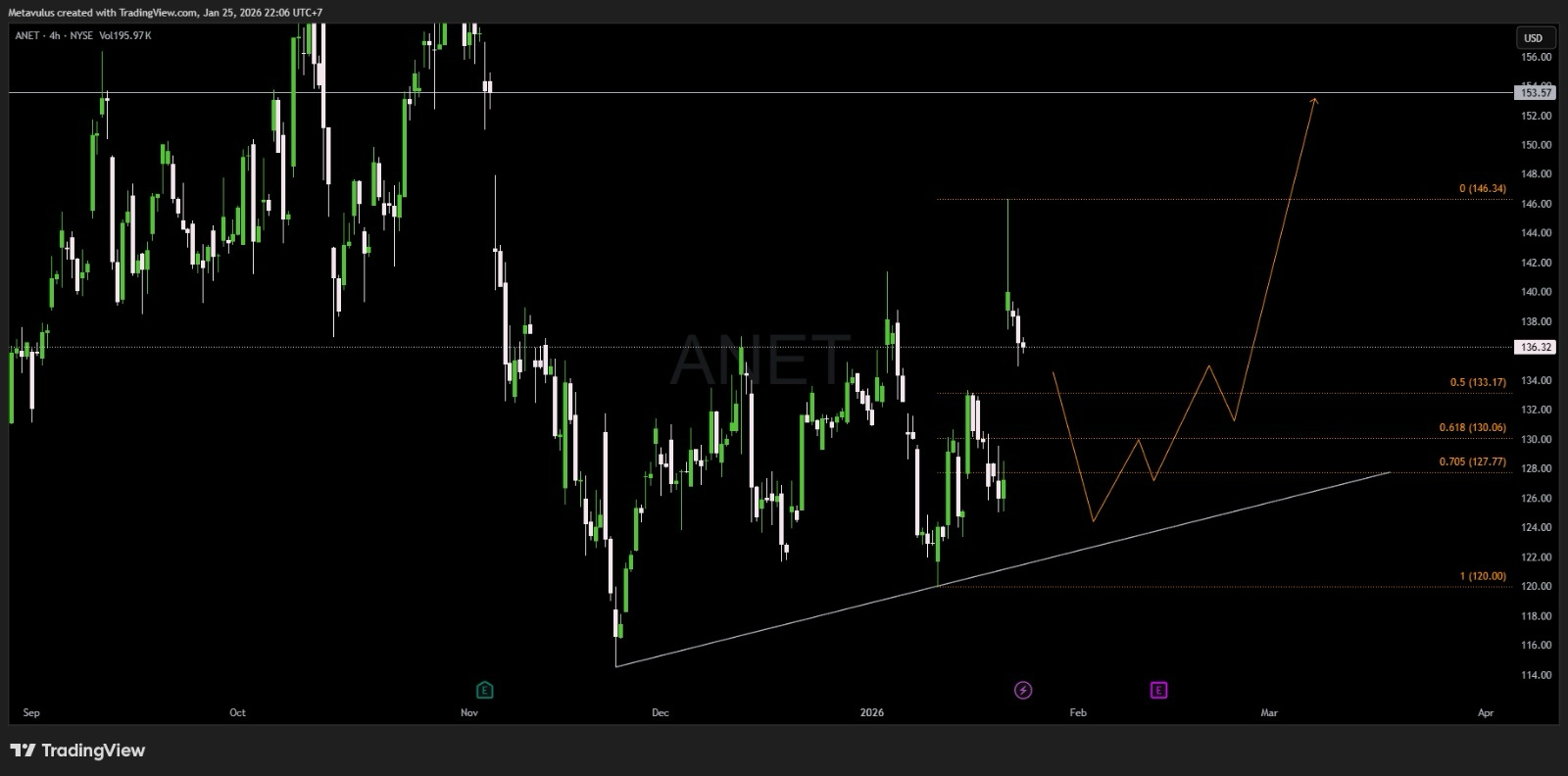 ANET terlihat seperti quality growth yang sedang “mendingin” setelah puncak, dan lebih menarik dimainkan sebagai akumulasi bertahap di area demand, bukan diburu saat harga lagi mepet resistance.