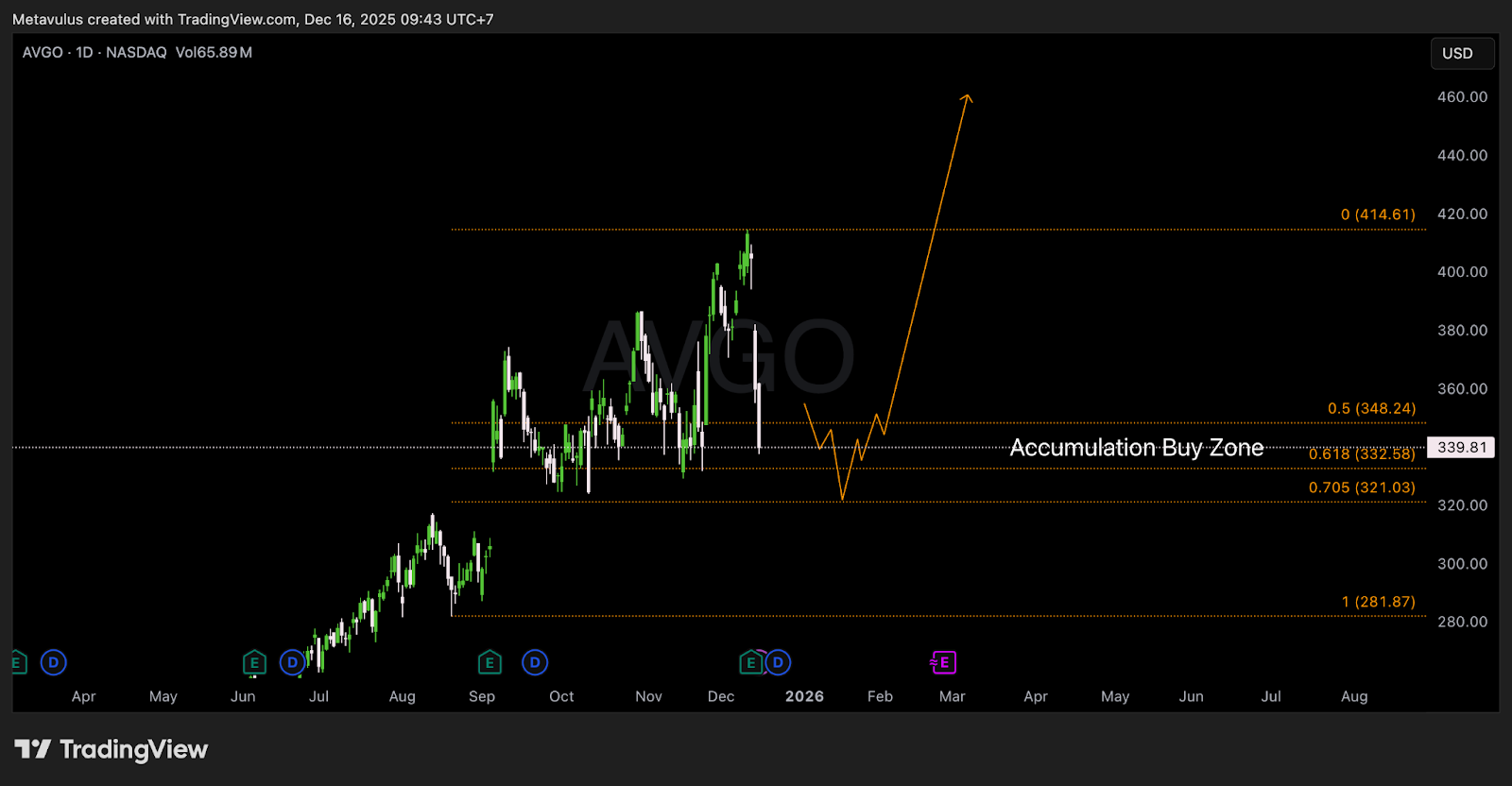 - Setelah spike ke area 400-an, AVGO “mean reversion” keras.