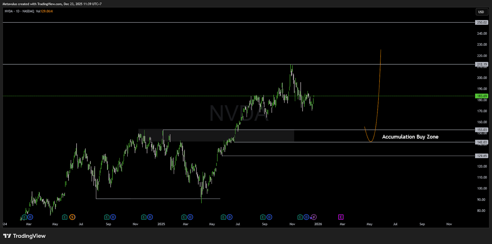 - Secara teknikal, chart jelas: ada “Accumulation Buy Zone” yang dipetakan di US$153.03 – US$142.03, dengan support lebih bawah sekitar US$129.65 (deep value/panic zone).