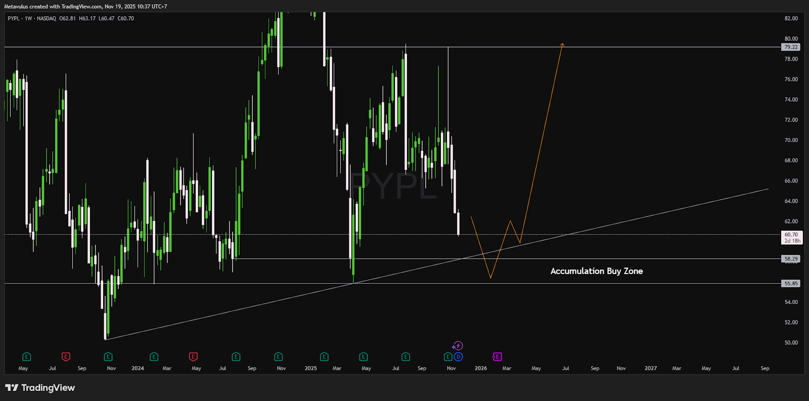 Selloff terakhir cuma bawa harga balik ke area support lama + trendline naik. Selama weekly candle bertahan di atas ~56, setup masih kelihatan seperti retest sehat sebelum potensi leg up menuju mid-70s sampai high-70s.