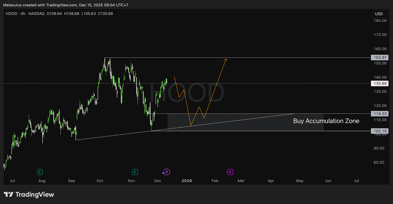 Dari sisi chart, kita sudah membangun Buy Accumulation Zone yang rapi di 114–102 dengan invalidasi jelas di bawah 100.