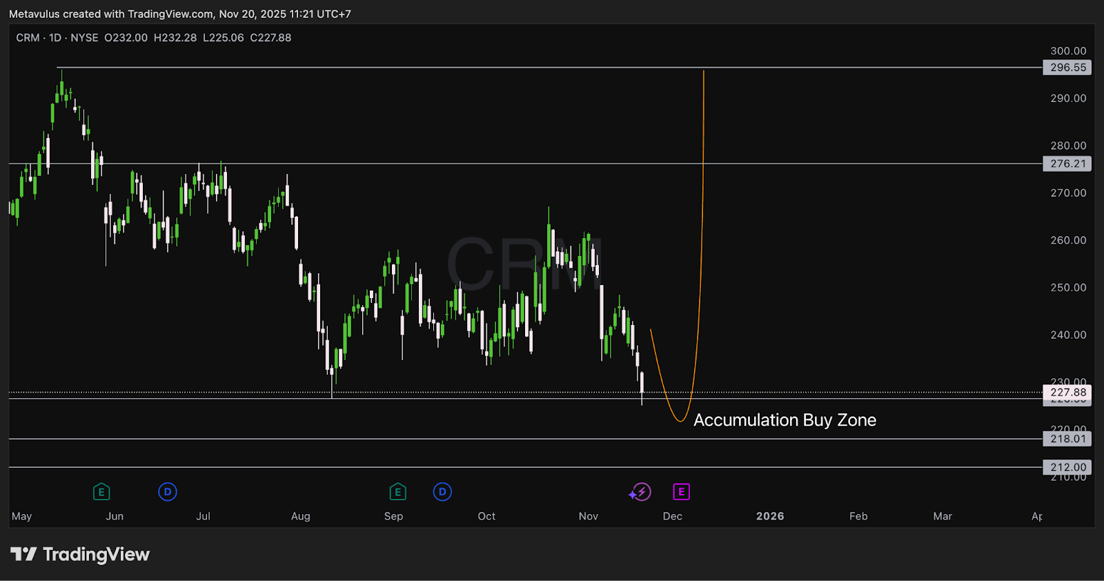 CRM sedang dalam fase re-rating bearish setelah akuisisi INFA dan revisi margin FY26.Namun area 218–212 adalah zona teknikal solid—tempat yang ideal untuk akumulasi perlahan.Selama harga bertahan di atas 212, struktur jangka panjang tetap bullish, dengan target recovery ke 270–295 saat sentiment stabil.