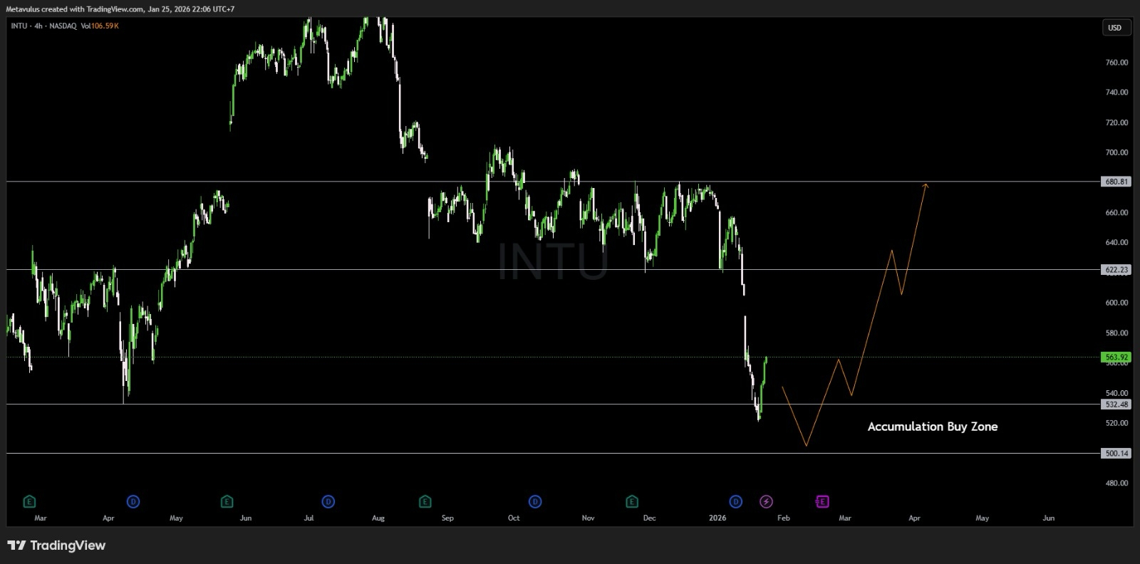 Dari data TradingView, INTU sekarang ada di US$563,97 (+2,97% di hari itu). Secara big picture, ini habis kena breakdown dari area atas dan mulai masuk fase “rebuild base”. Jadi pertanyaan utamanya bukan “bagus atau jelek”, tapi:
