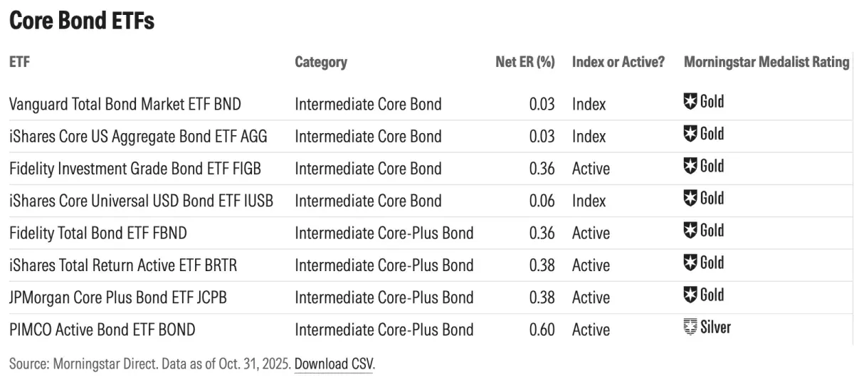 Untuk strategi inti yang minim risiko, investor umumnya memilih produk berbasis indeks seperti Vanguard Total Bond Market ETF. ETF jenis ini memberikan akses biaya rendah ke pasar obligasi tingkat investasi (investment-grade) yang stabil.