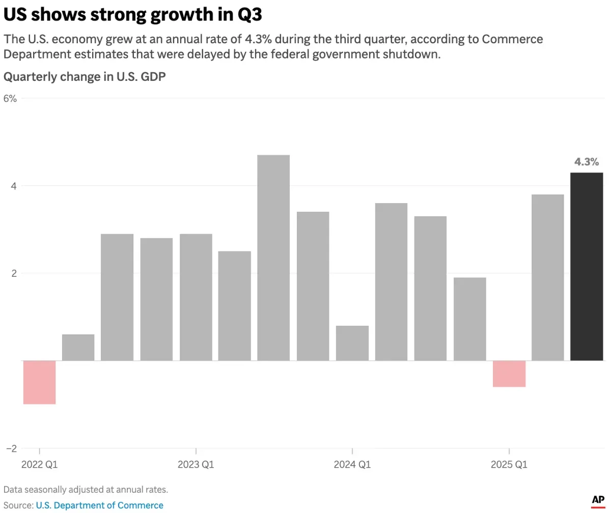 - PDB AS tumbuh 4,3% di Q3, didorong oleh belanja konsumen yang kuat meski ada tekanan inflasi.