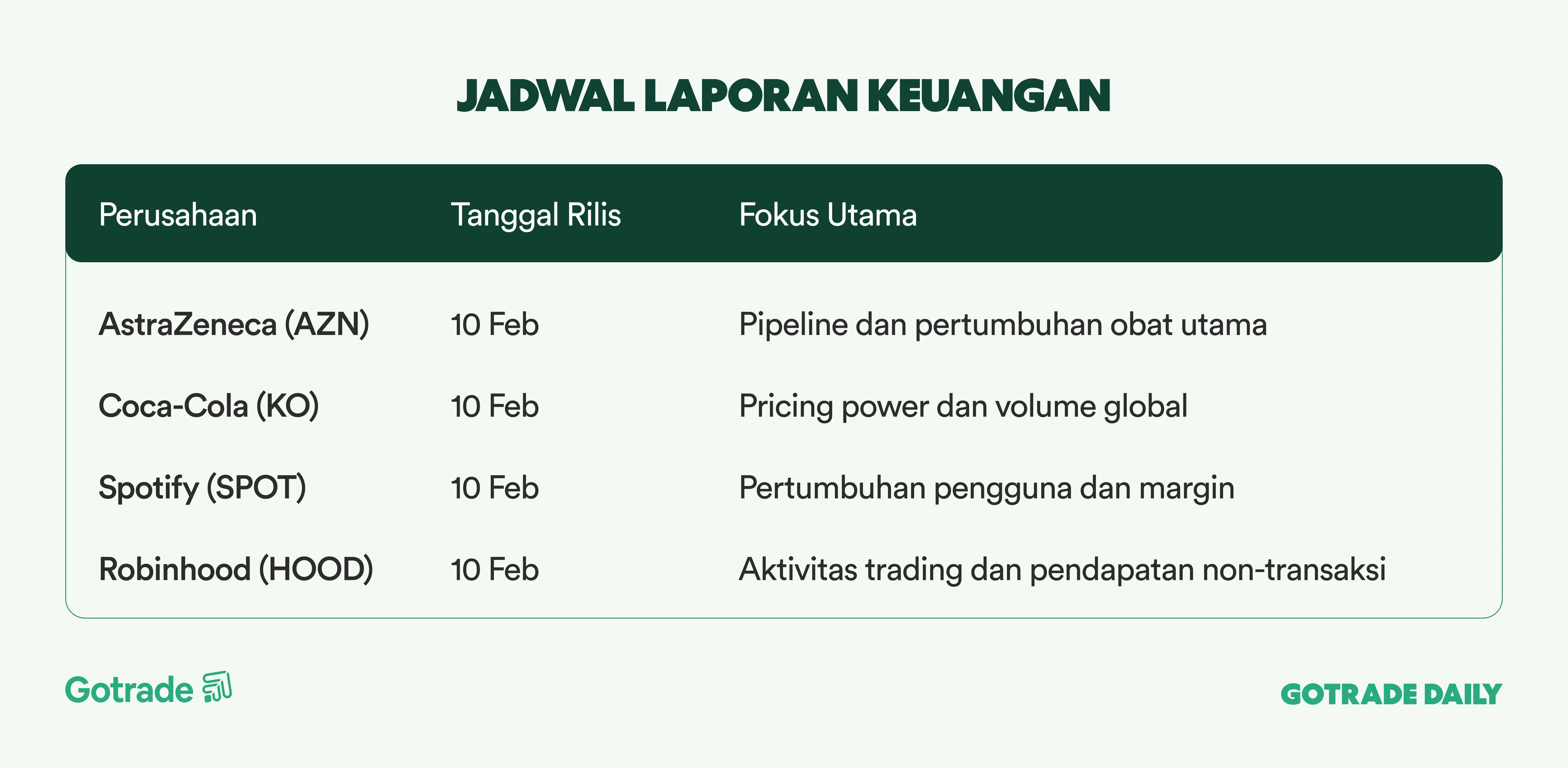 Sektor konsumen dan platform juga menjadi sorotan. Coca-Cola (KO) dan McDonald’s (MCD) diharapkan memberi insight soal daya beli dan pricing power, sementara Ford (F), Honda (HMC), dan Ferrari (RACE) akan mencerminkan kondisi permintaan otomotif global. Di sisi lain, laporan dari Marriott (MAR) dan Airbnb (ABNB) akan dipantau untuk membaca tren perjalanan, sementara Robinhood (HOOD) dan Coinbase (COIN) tetap diperhatikan di tengah volatilitas pasar kripto.