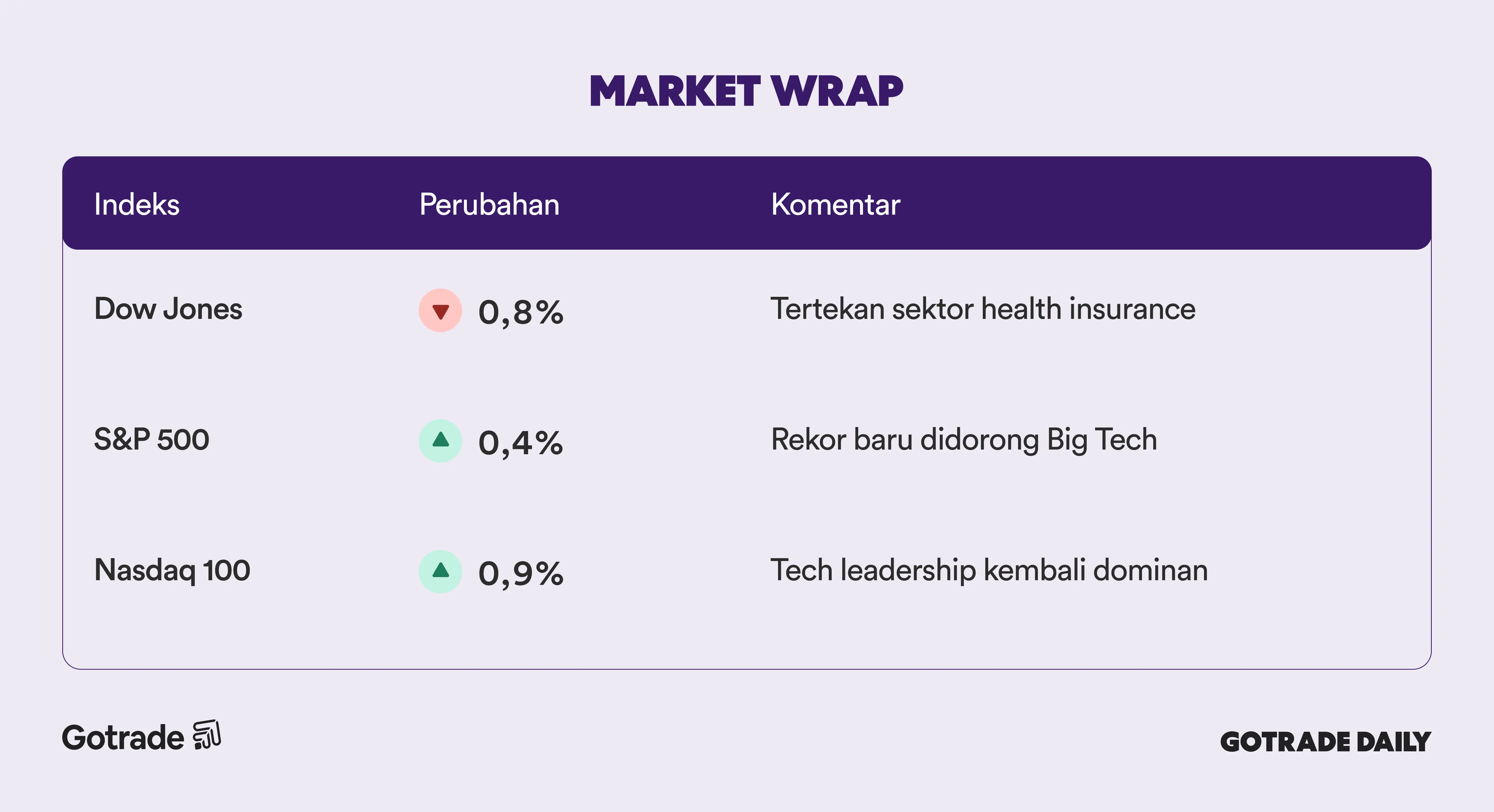 Indeks saham AS bergerak menguat pada Selasa, dengan S&P 500 mencetak rekor intraday baru seiring penguatan saham teknologi besar menjelang pekan krusial earnings dan keputusan suku bunga Federal Reserve. S&P 500 naik 0,41%, Nasdaq Composite melonjak 0,91%, sementara Dow Jones justru turun 0,83% akibat tekanan besar dari sektor asuransi kesehatan.