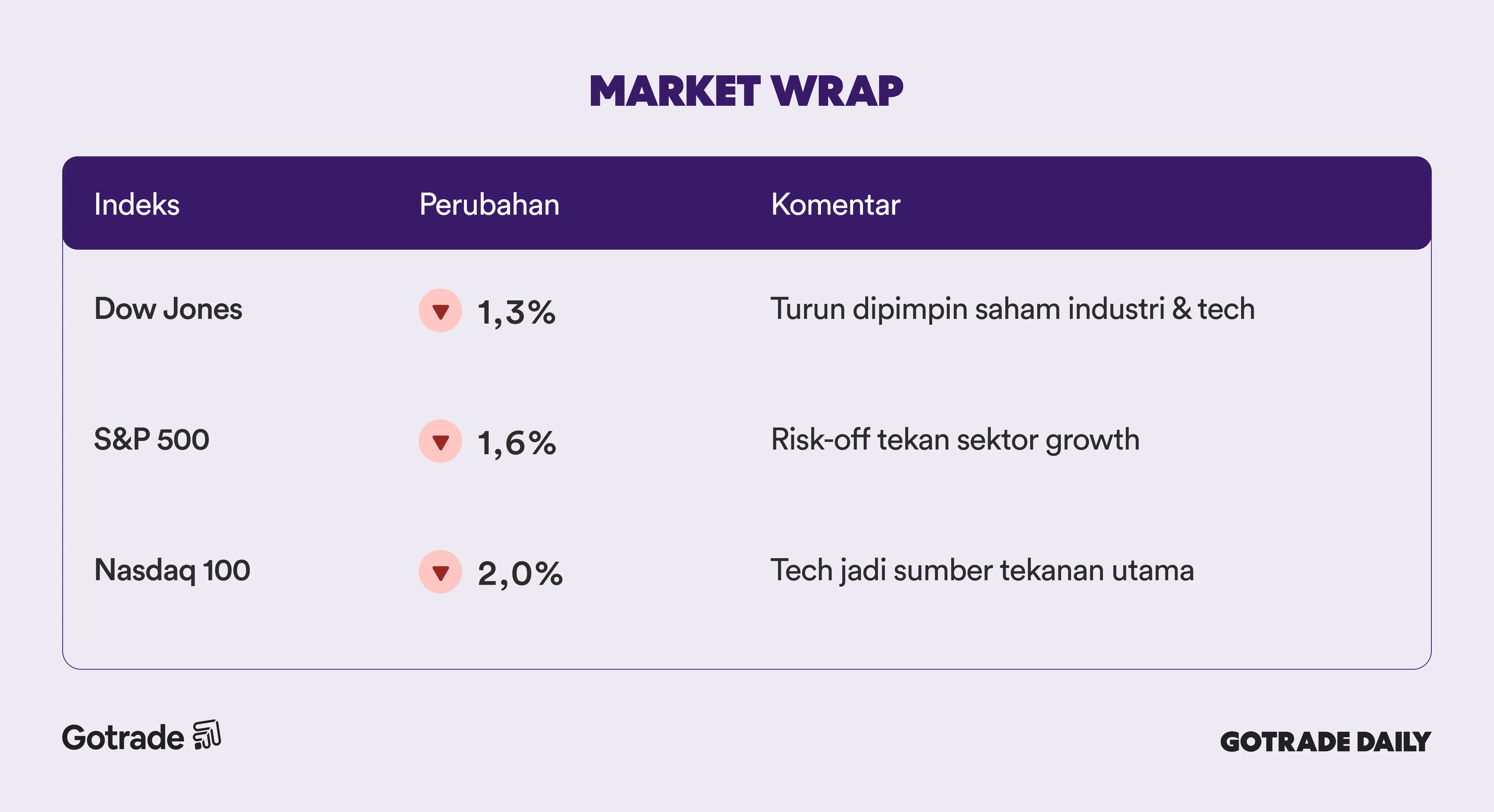 Indeks saham AS ditutup melemah setelah kekhawatiran terhadap dampak disrupsi kecerdasan buatan meningkat dan memicu aksi jual di sejumlah sektor. Dow Jones turun 669,42 poin atau 1,34% ke 49.451,98, S&P 500 melemah 1,57% ke 6.832,76, dan Nasdaq 100 turun sekitar 2,0%, mencerminkan tekanan kuat pada saham teknologi dan pertumbuhan tinggi.