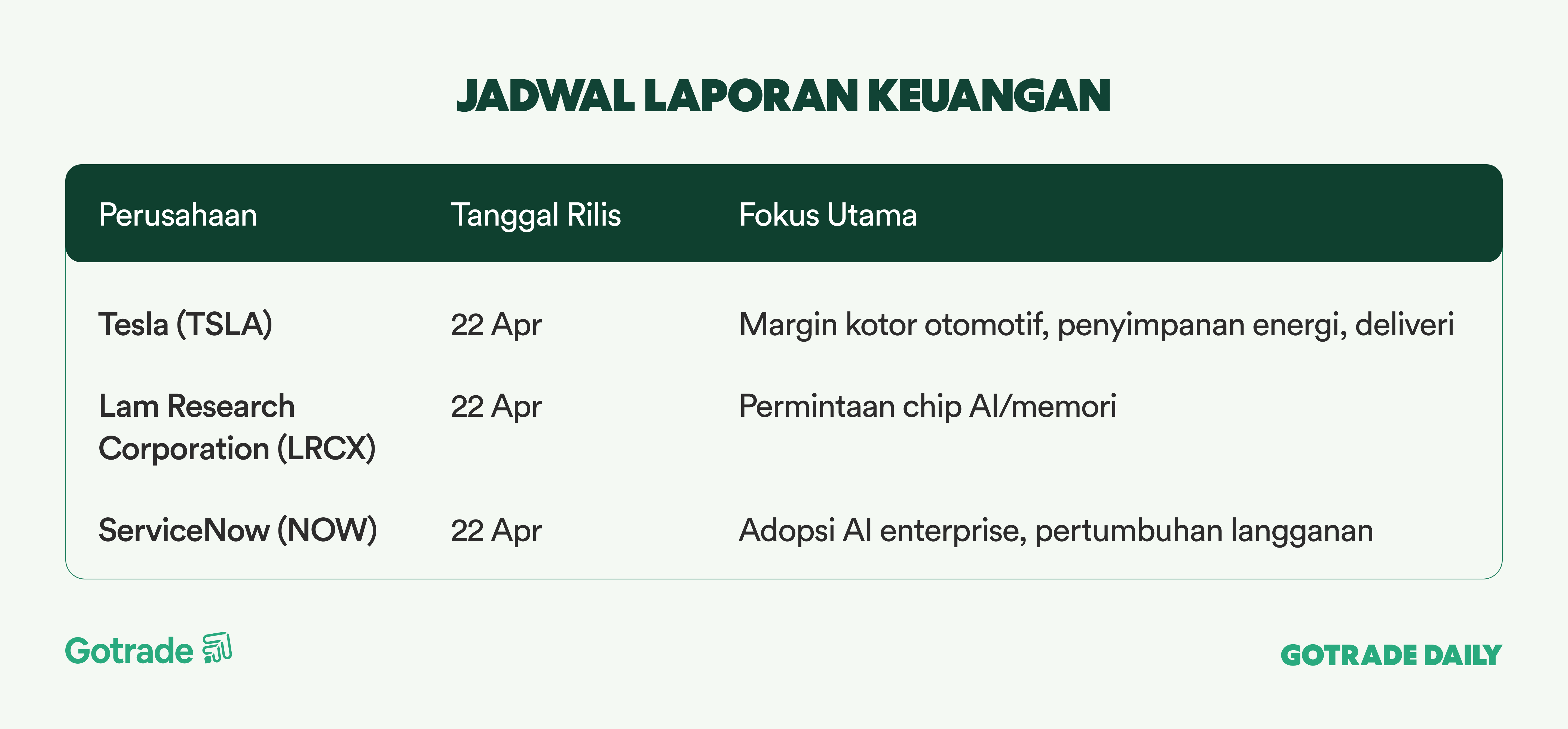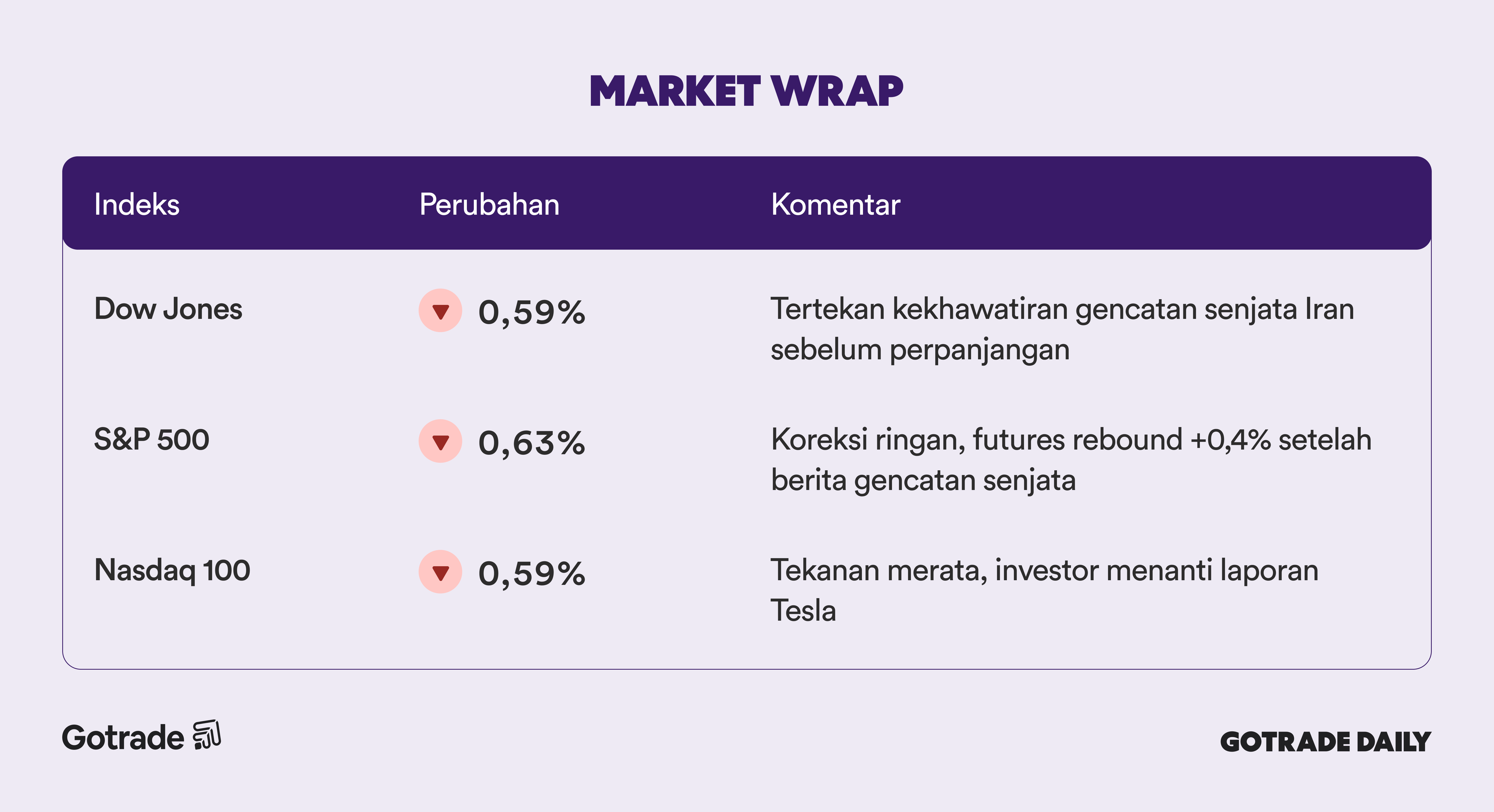 Pasar hari ini dibentuk oleh dua kekuatan: meredanya risiko geopolitik dari perpanjangan gencatan senjata Iran dan antisipasi laporan Tesla yang bisa menentukan arah saham teknologi pekan ini.