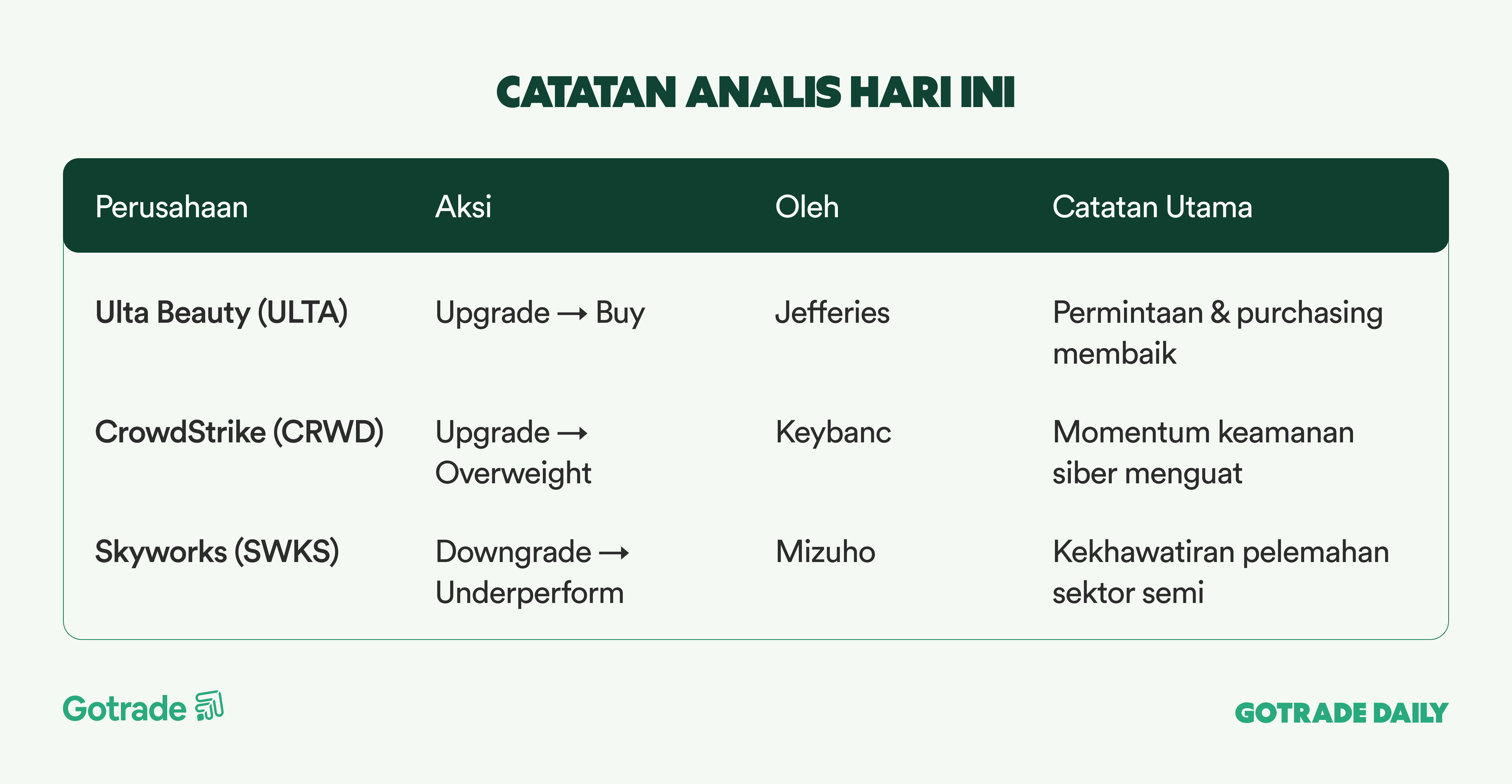 Kinerja kuat ini didorong oleh segmen asuransi dan unit Optum, serta efisiensi biaya medis yang lebih baik. Selain itu, UNH menaikkan proyeksi EPS tahunan menjadi di atas $18,25 dan mengumumkan buyback hingga $2 miliar, memperkuat sentimen positif di sektor healthcare secara keseluruhan.